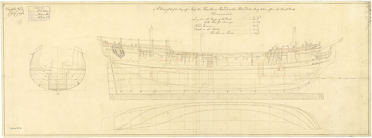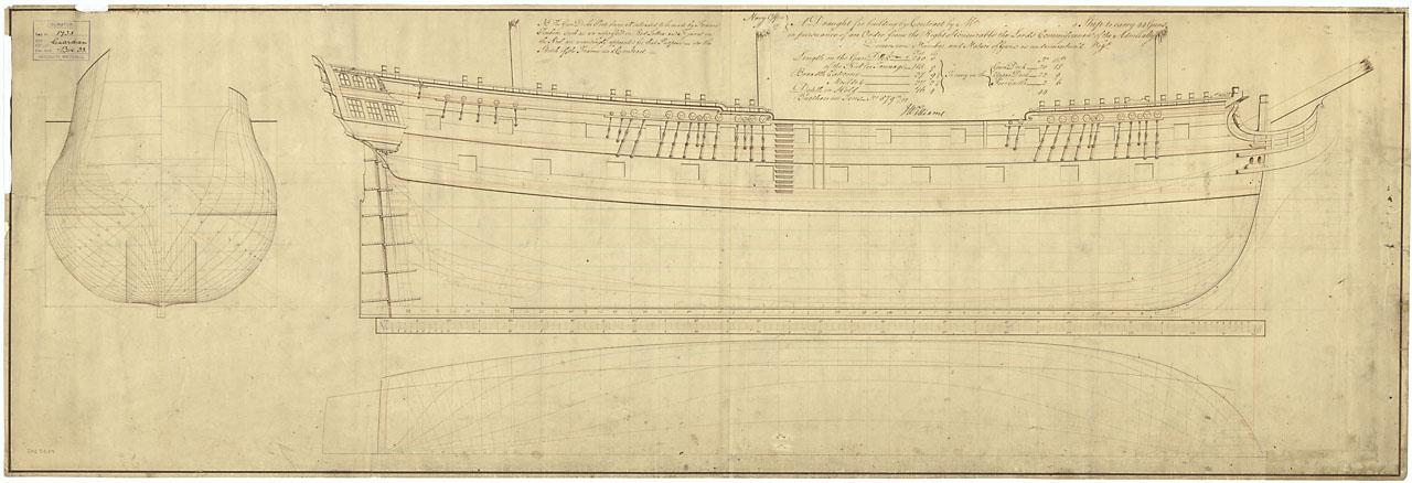 Unnamed ship of the Roebuck class (1767). Scale: 1:48. Plan showing the body plan, sheer lines, longitudinal half - breadth for building the unknown (and unnamed) 44 - gun Fifth Rate two-decker of the Roebuck Class.