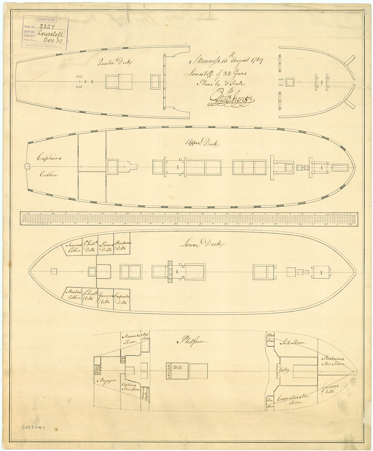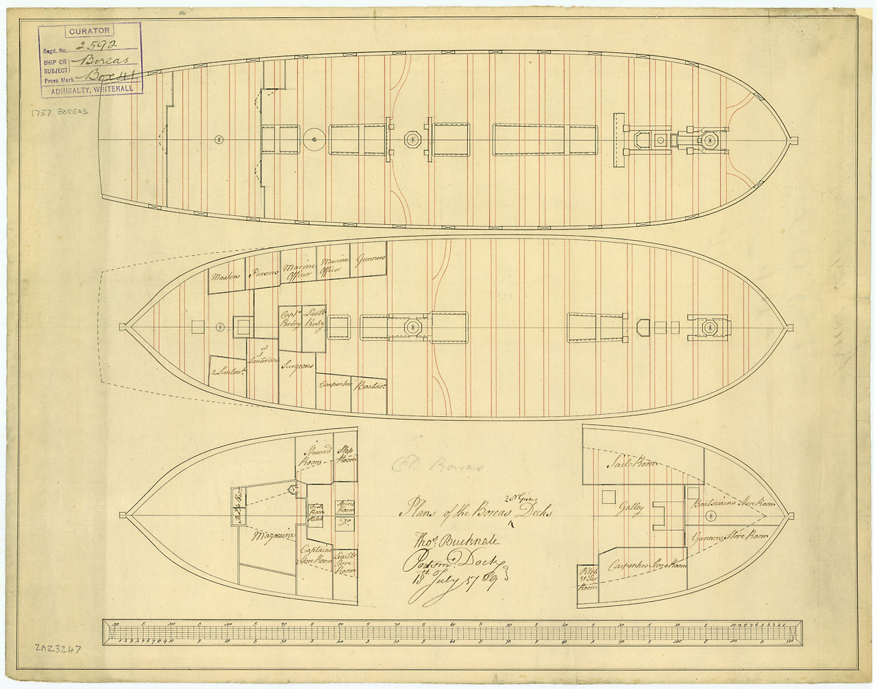 Boreas (1757). Scale 1:96. Plan showing the upper deck, lower deck plans, fore and aft platforms for Boreas (1774), a 28-gun, Sixth Rate Frigate, as taken off at Portsmouth Dockyard after being launched at Hodgen Yard in Kingston upon Hull. Signed Thomas