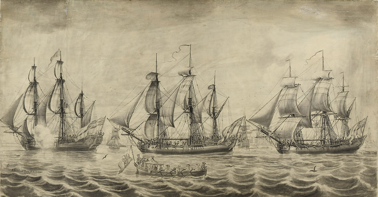 Three ships of the Hudson's Bay Company off Greenwich. John Hood, was a shipwright who lived at Limehouse. He specialized in large pen and wash drawings of shipping scenes (including storms) which he exhibited at the Society of Artists and the Free S