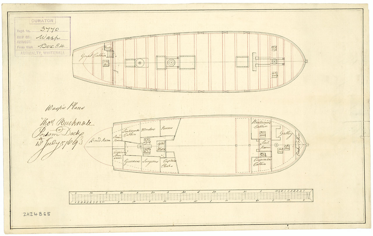 Weazle (1745). Scale: 1:96. Plan showing the upper deck, lower deck and after platform for Weazle (1745), a 16-gun two-masted Ship Sloop.