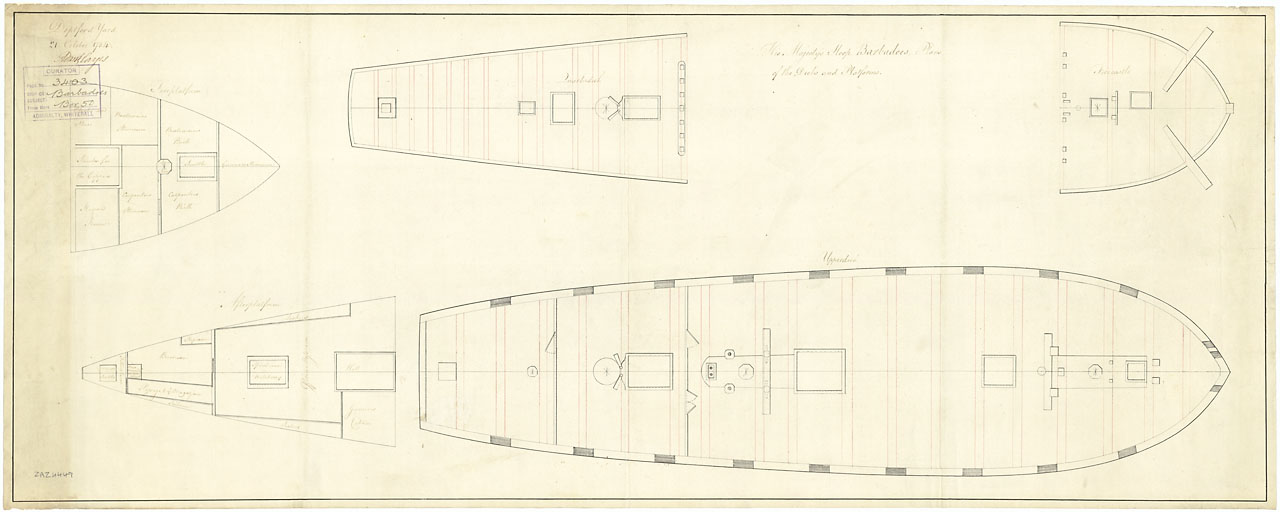 Barbadoes (1778). Scale: 1:48. Plan showing the quarterdeck, forecastle, upper deck, and fore and after platforms for the Barbadoes (1778), a 12-gun Ship Sloop, as taken off at Deptford. The plan possibly illustrates the ship as she was original fitted,