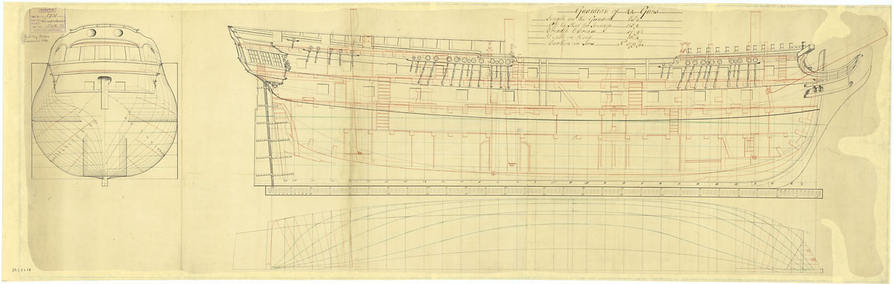 Guardian (1784). Scale: 1:48. Plan showing the body plan with stern board outline, sheer lines with inboard detail, longitudinal half - breadth for Guardian (1784), a 44 - gun Fifth Rate two - decker as built at Limehouse by Mr. Batson.