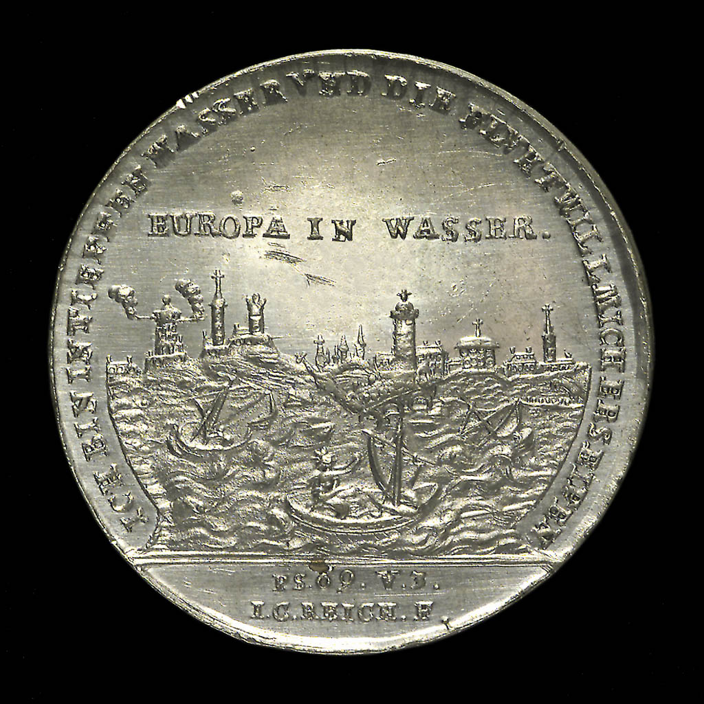 Medal commemorating the floods in Europe, 1784. Medal commemorating the floods in Europe, 1784. Obverse: Small boats picking up drowning men in rough water, a city in distance. Legend: 'ICH BIN INTIEFFEN WASSER VND DIE FLVHTWILLMICH ERSEIFEN.' (