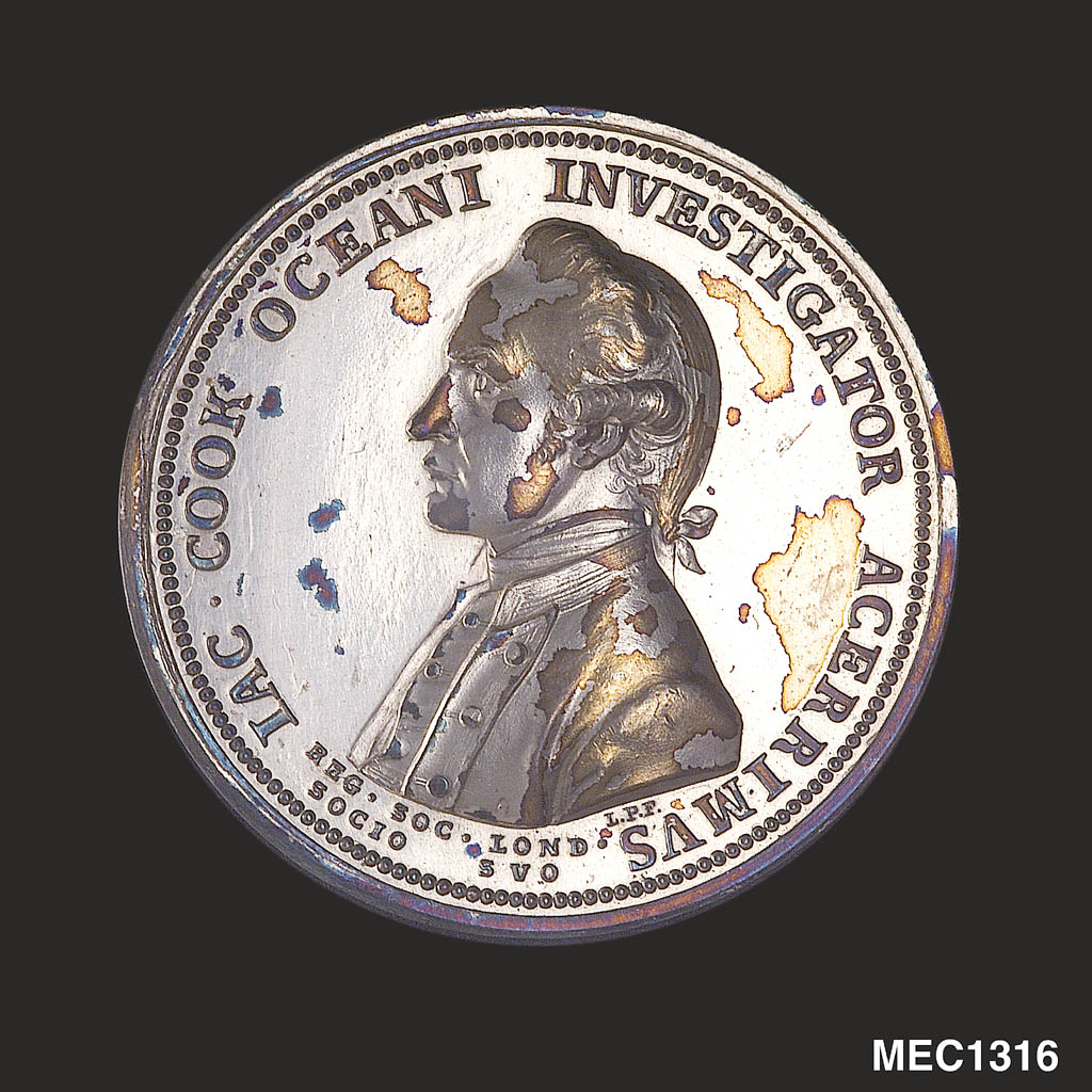Medal commemorating Captain James Cook (1728-1779). Medal commemorating Captain James Cook (1728-1779). Medal struck by the Royal Society in memory of Cook. Obverse: Bust of Captain Cook in tie-wig and uniform (left). Legend: 'IAC . COOK OCEANI INVES
