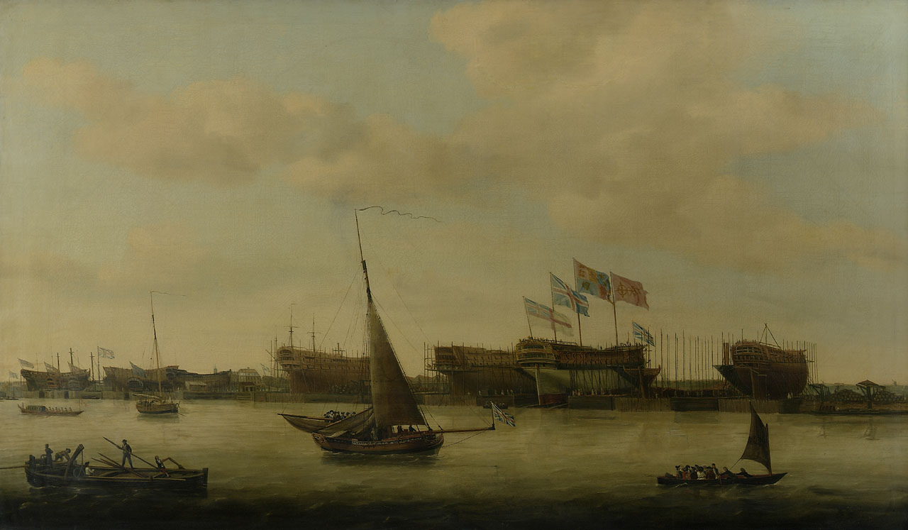 Launch of the 'Venerable', 74 guns, at Blackwall, 19 April 1784. The received title of this oil painting is the 'Launch of HMS Venerable at Blackwall'. The picture shows John Perry's (later Green's) yard at Blackwall on the n