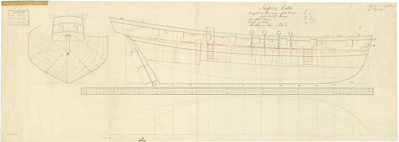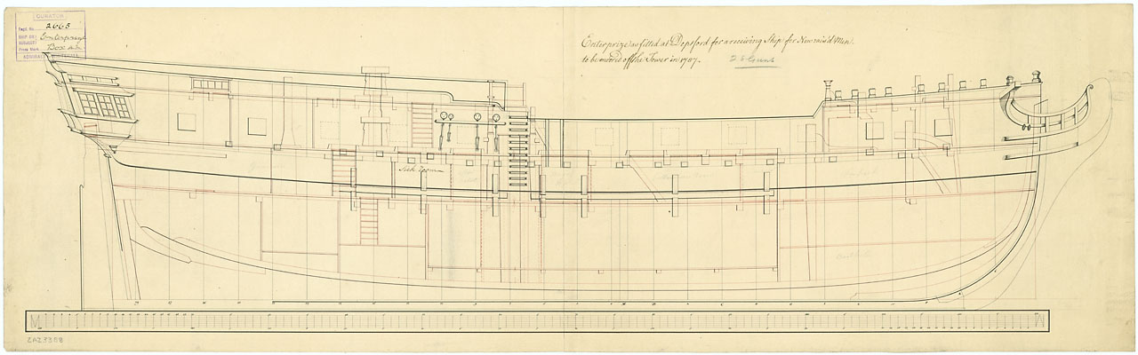 Enterprize (1774). Scale 1:48. Plan showing the inboard profile plan for Enterprize (1774), a 28-gun, Sixth Rate Frigate, as converted and fitted to a Recieving Ship, to be moored by the Tower of London.