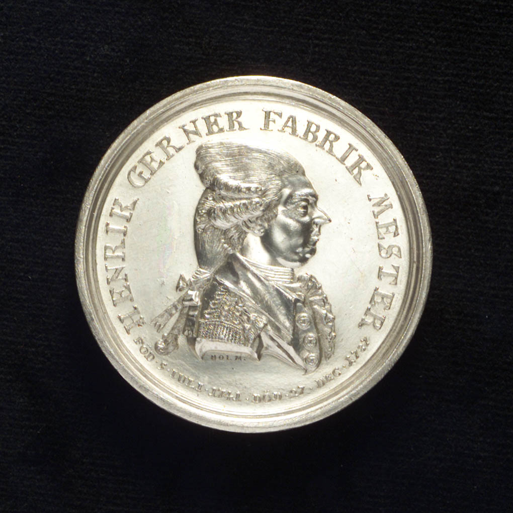 Medal commemorating Captain Henrik Gerner. Medal commemorating Captain Henrik Gerner. Obverse: Bust of Captain Gerner in a full tie-wig open uniform, coat and lace cravat (right). Legend: 'HENRIK GERNER FABRIK MESTER.' (Henrik Gerner, Master of