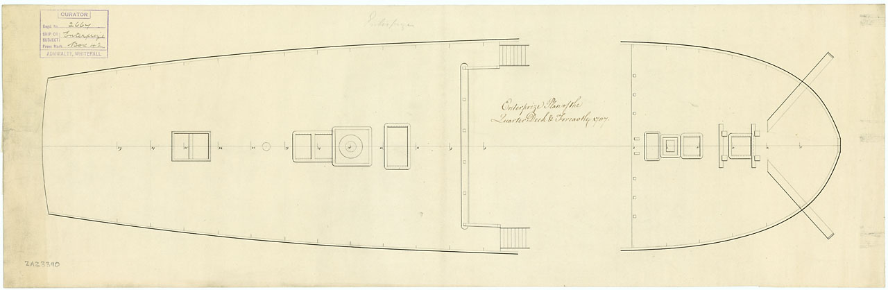 Enterprize (1774). Scale 1:48. Plan showing the quarter deck, and forecastle for Enterprize (1774), a 28-gun, Sixth Rate Frigate, as fitted for a Receiving Ship to be moored by the Tower of London.