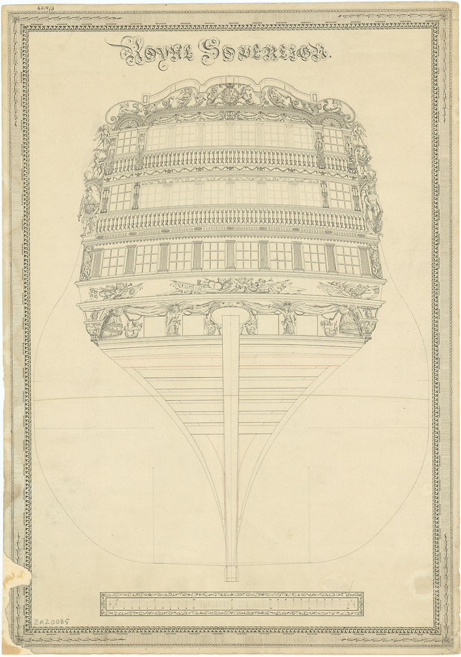 Royal Sovereign (1786). Scale: 1:48. Plan showing the sternboard outline with decoration detail for Royal Sovereign (1786), a 100-gun First Rate, three-decker. The whole plan is enclosed within a decorative boarder.