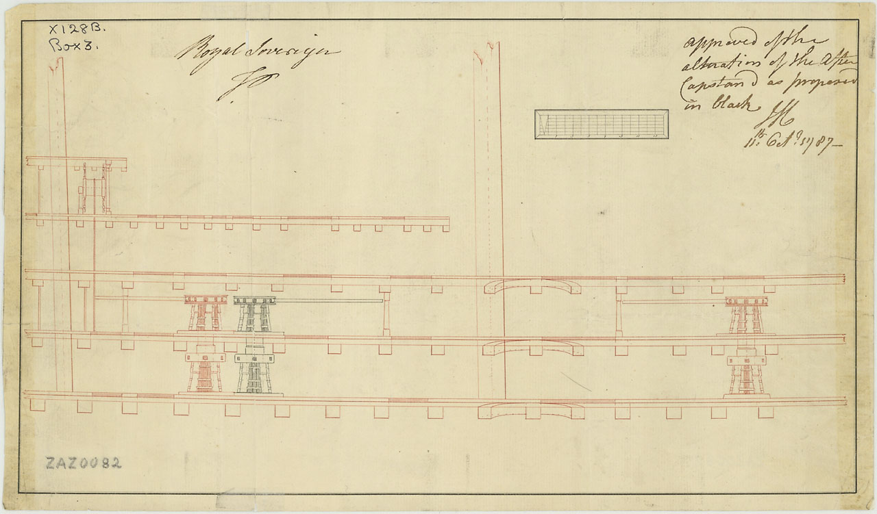 Royal Sovereign (1786). Scale: 1:96. Plan showing an inboard elevation between the mizzen and main masts illustrated the proposed and agreed alterations to the after capstan positions for Royal Sovereign (1786), a 100-gun First Rate, three-decker. These a