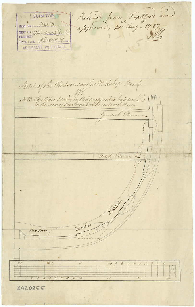 Windsor Castle (1790). Scale 1:48. A plan showing the midship section for 'Windsor Castle' (1790), a 90-gun Second Rate, three-decker, illustrating the proposed (and approved) introduction of a rider in place of a standard knee.