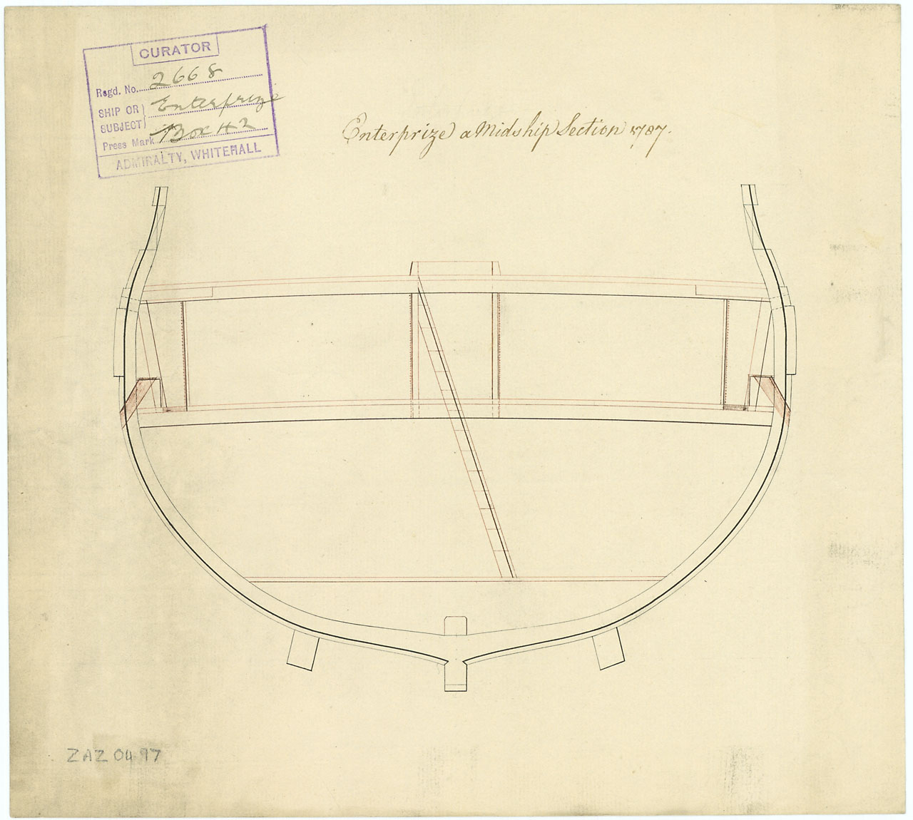 Enterprize (1774). Scale 1:48. Plan showing the midship section for Enterprize (1774), a 28-gun, Sixth Rate Frigate, as converted to a Receiving ship to be moored by the Tower of London. Bilge keels heave been added on the plan.