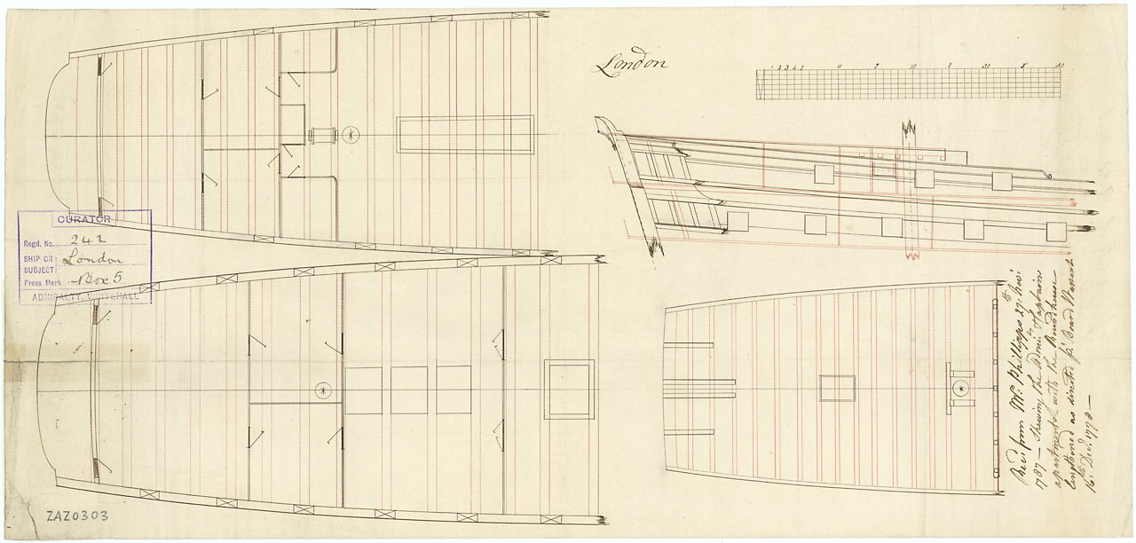London (1766). Scale 1:96. Plan showing the roundhouse, quarterdeck and an elevation of the after part of the upper deck and quarterdeck illustrating the Admiral's and Captain's apartments for 'London' (1766), a 90-gun Second Rate, thr