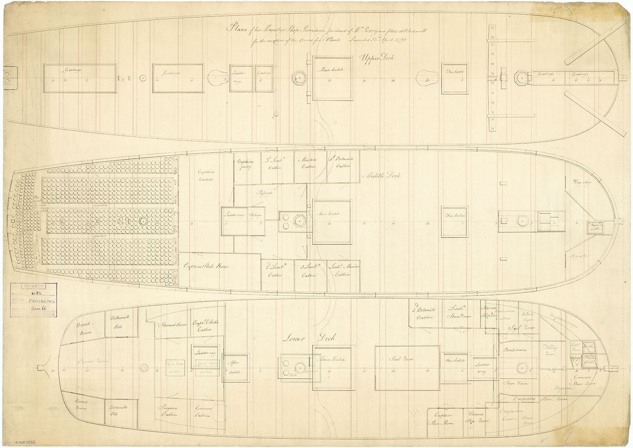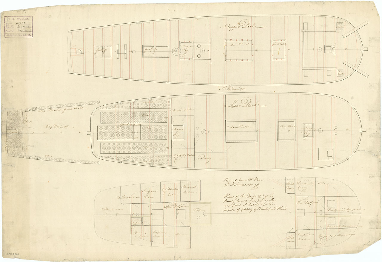 Bounty (1787). Scale: 1:48. Plan showing the upper deck, lower deck and fore/aft platforms for HM Transport Bounty (1787), as fitted at Deptford Dockyard for transporting breadfruit plants.