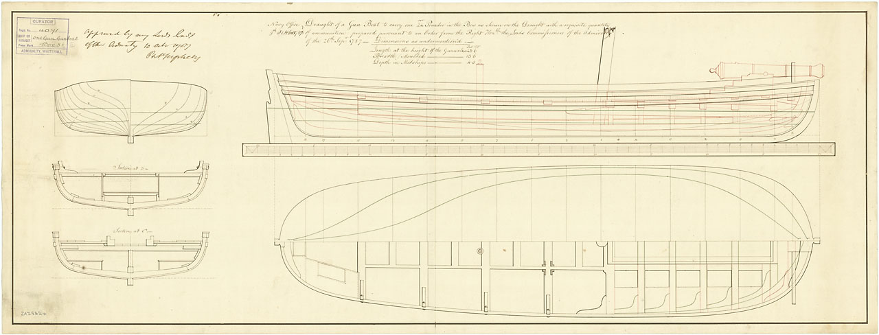 50ft Lighter (circa 1788). Scale: 1:32. A plan showing the body plan, sheer lines with inboard detail, and longitudinal half-breadth proposed [and approved] for a fifty foot lighter, for service in Woolwich Dockyard. Note she was built with the modificat
