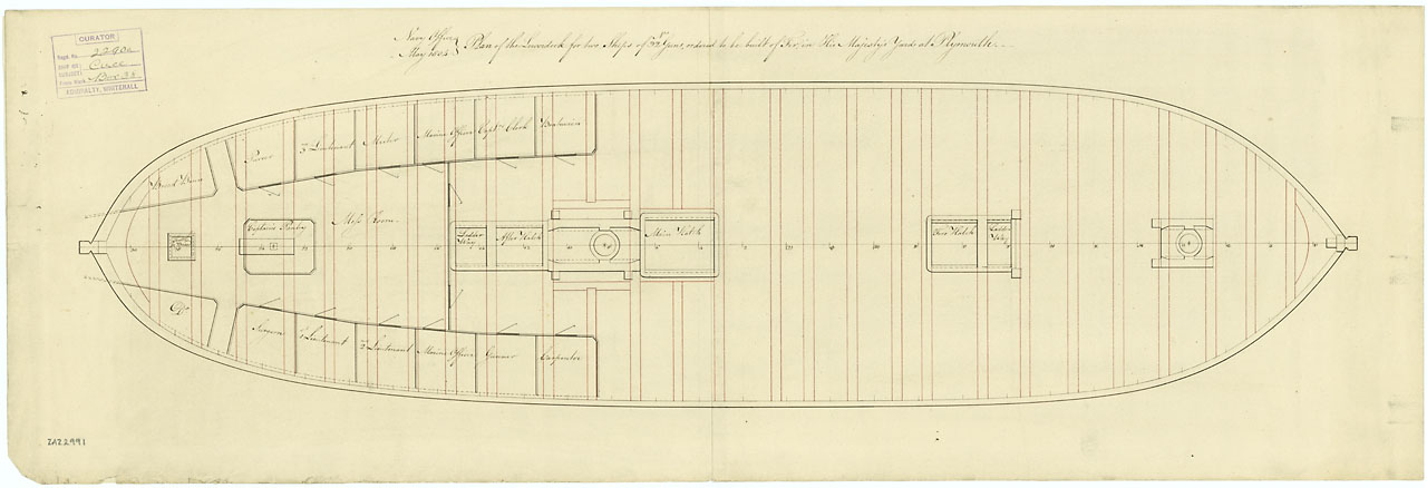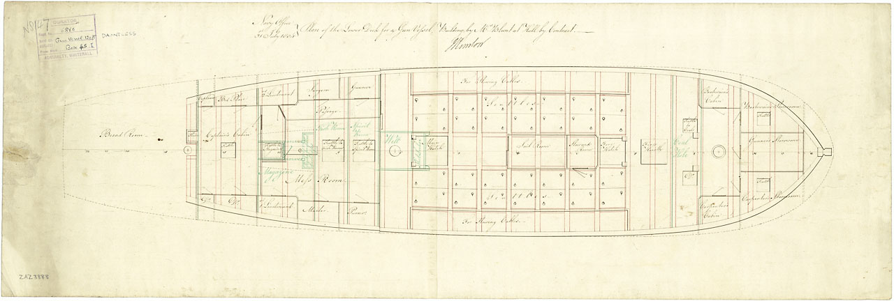 Dauntless (1804); Valorous (1804). Scale: 1:48. Plan showing the lower deck for Dauntless (1804) and Valorous (1804), both 18-gun Ship Sloops building at Hull by Mr Blunt. The plan includes alterations proposed by Mr Stainforth, MP.