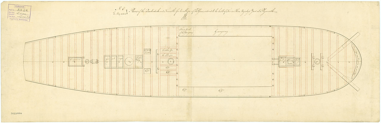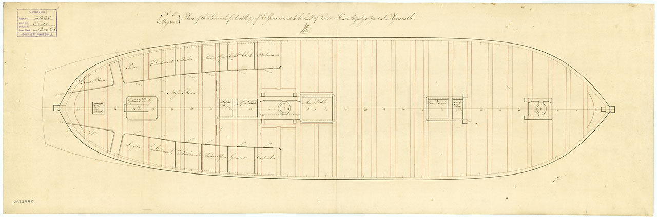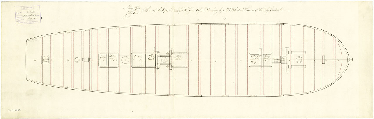 Dauntless (1804); Valorous (1804). Scale: 1:48. Plan showing the upper deck for Dauntless (1804) and Valorous (1804), all 18-gun Ship Sloops building at Hull by Mr Blunt.