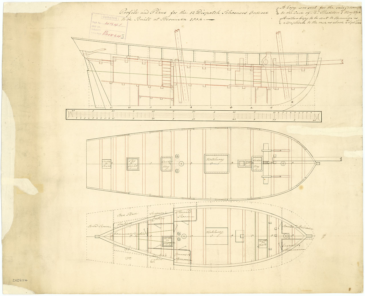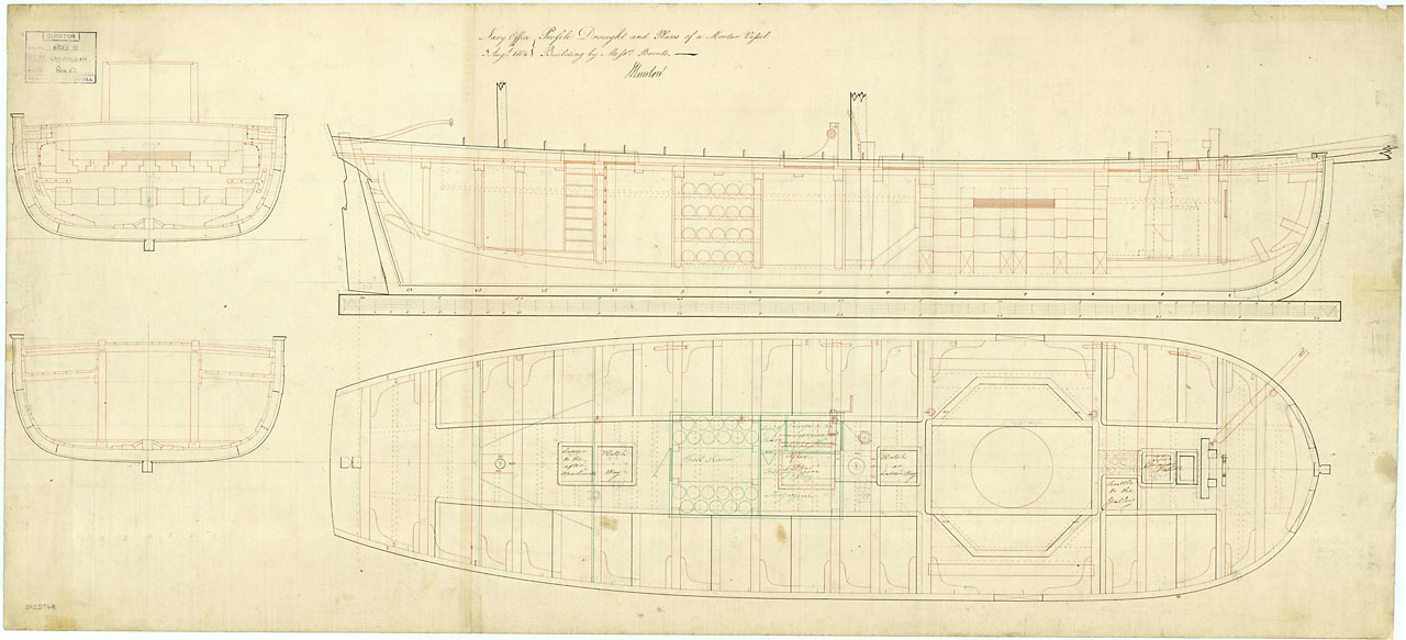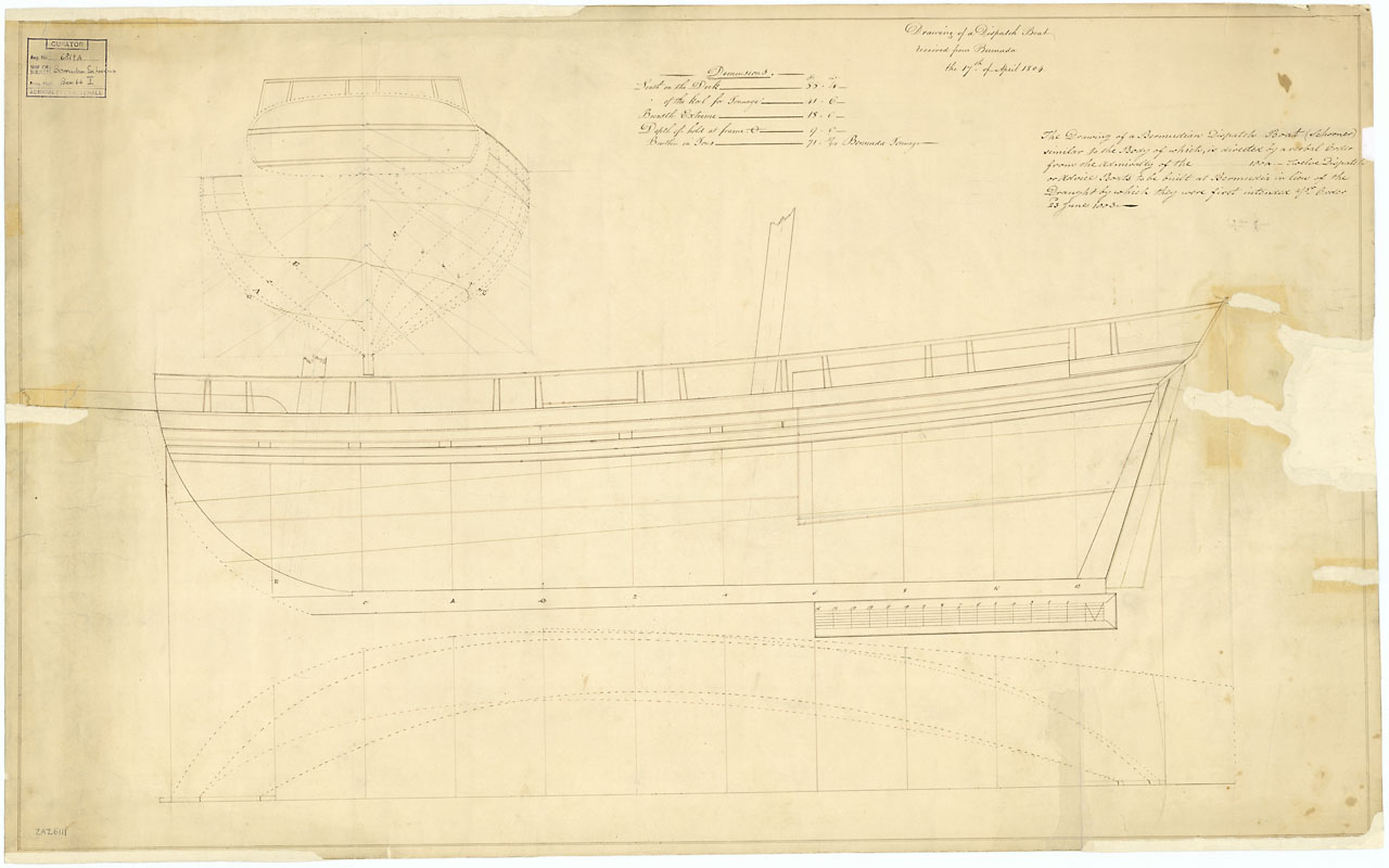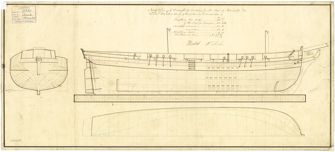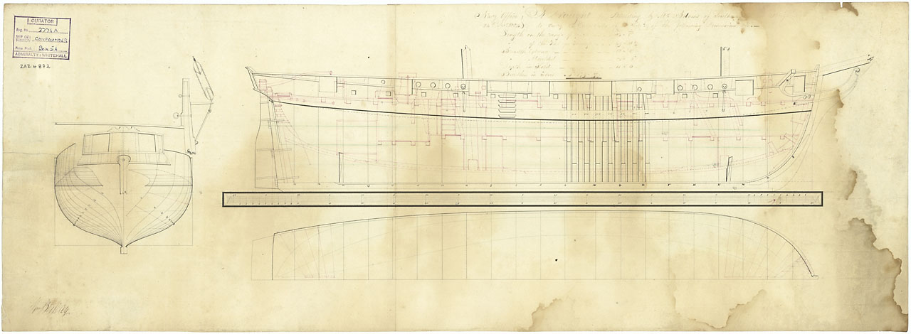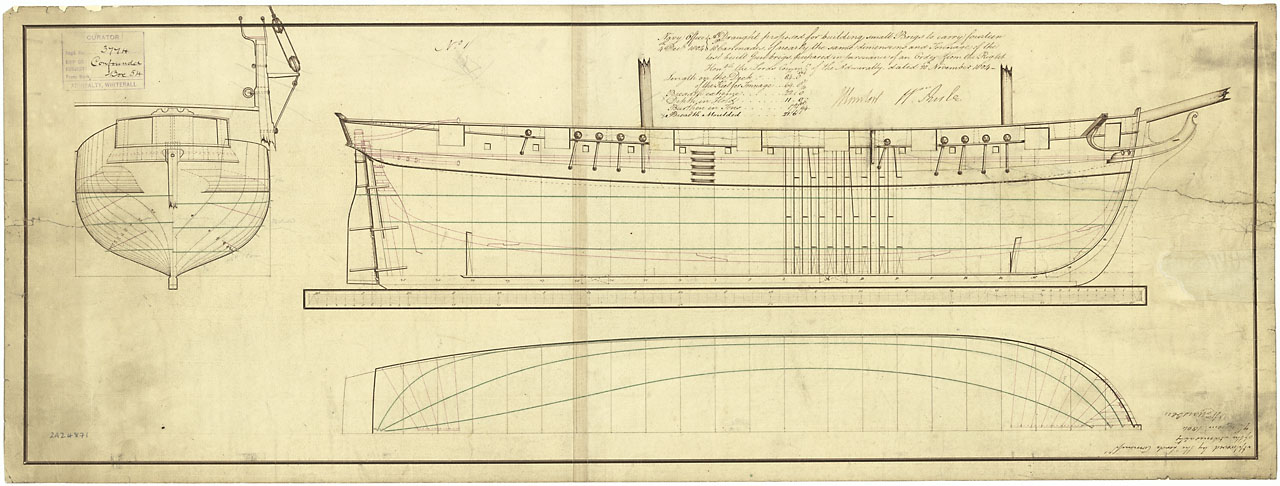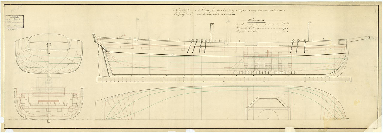 60ft Water Tank Vessel (1804). Scale: 1:48. A plan showing the body plan, basic profile, and longitudinal half-breadth for a three-masted, cedar-built, copper-fastened, sixty foot water carrier for the Jamaica Station, as designed by Captain Andrew Fitzh