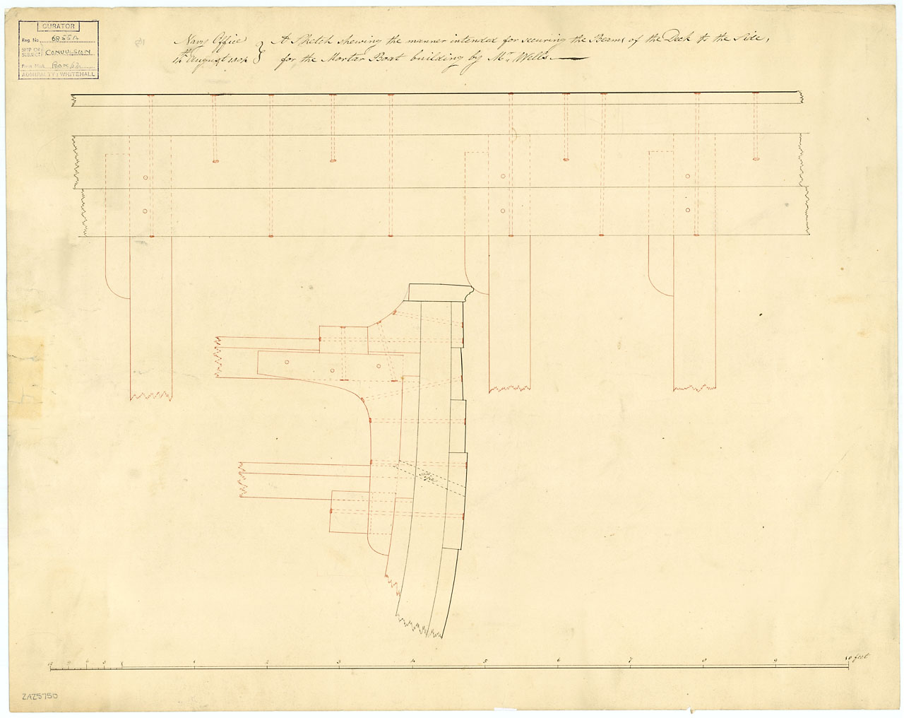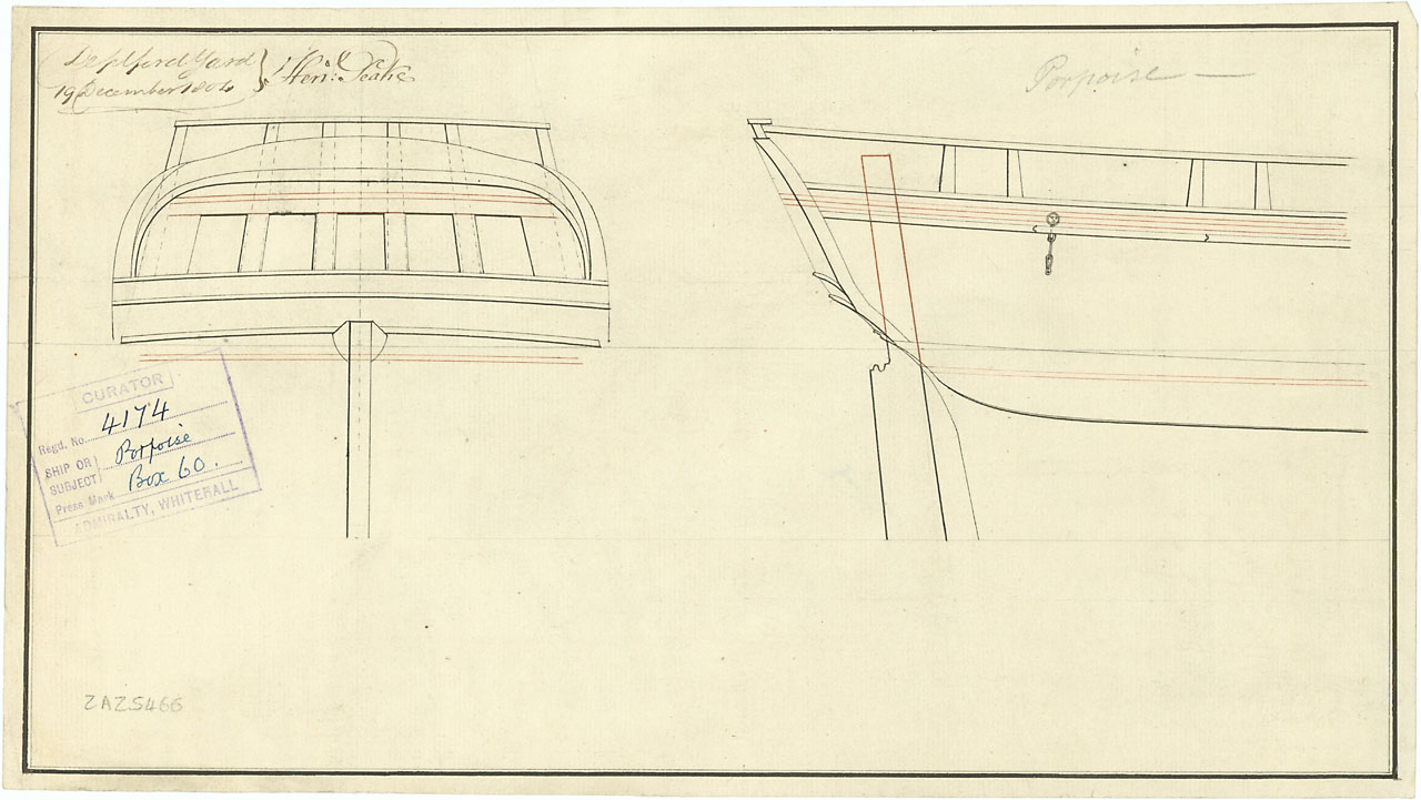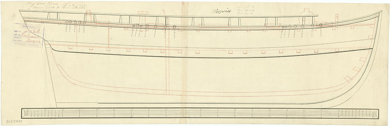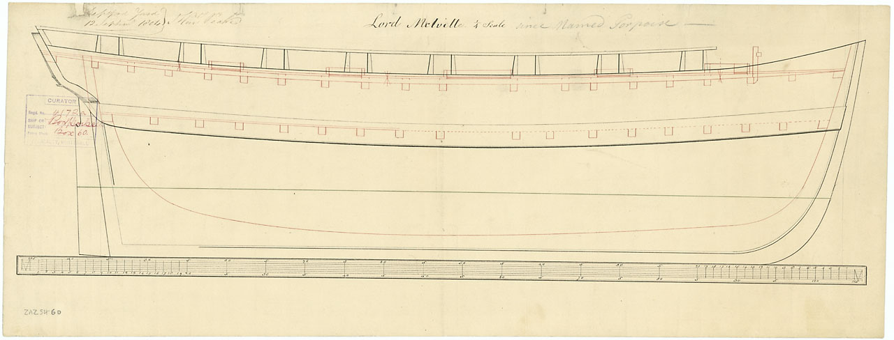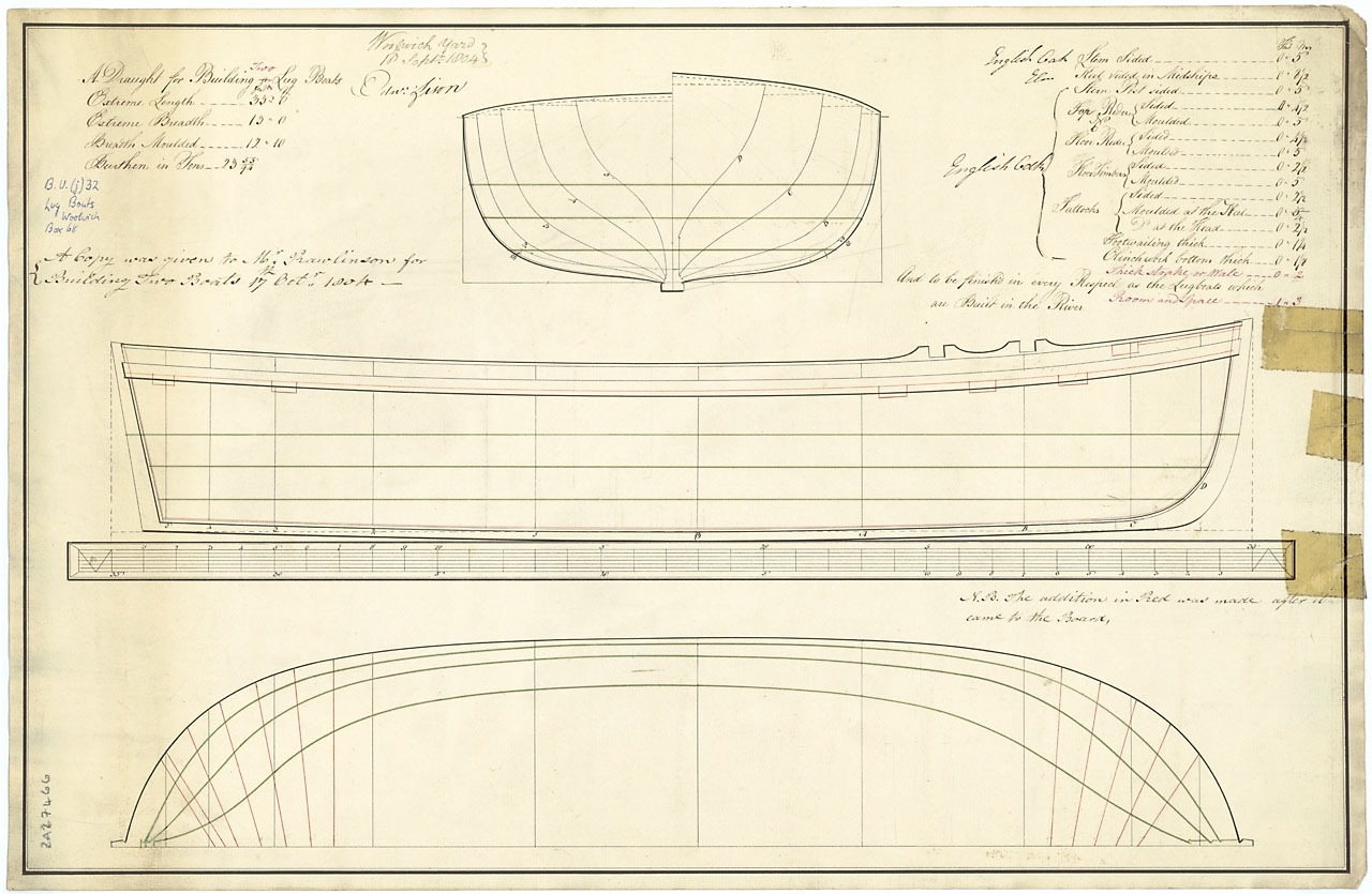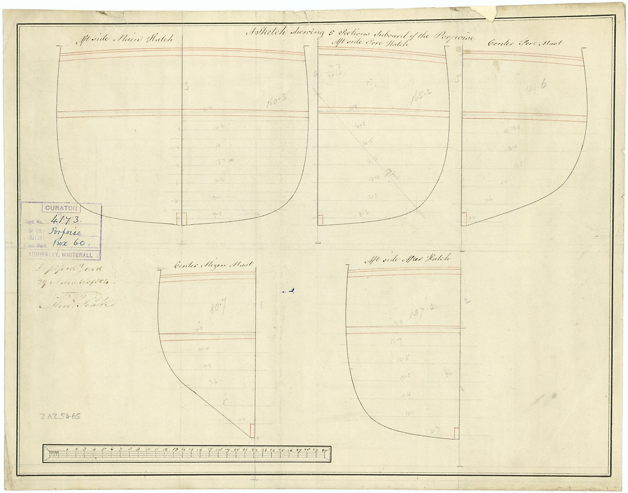 60ft Water Tank Vessel (1804). Scale: 1:48. A plan showing the body plan, basic profile, and longitudinal half-breadth for a three-masted, cedar-built, copper-fastened, sixty foot water carrier for the Jamaica Station, as designed by Captain Andrew Fitzh