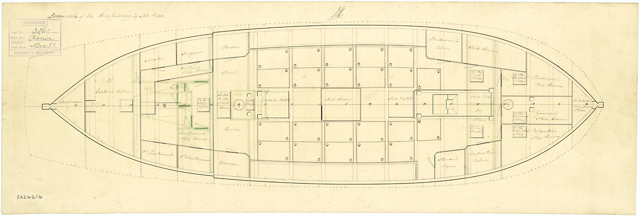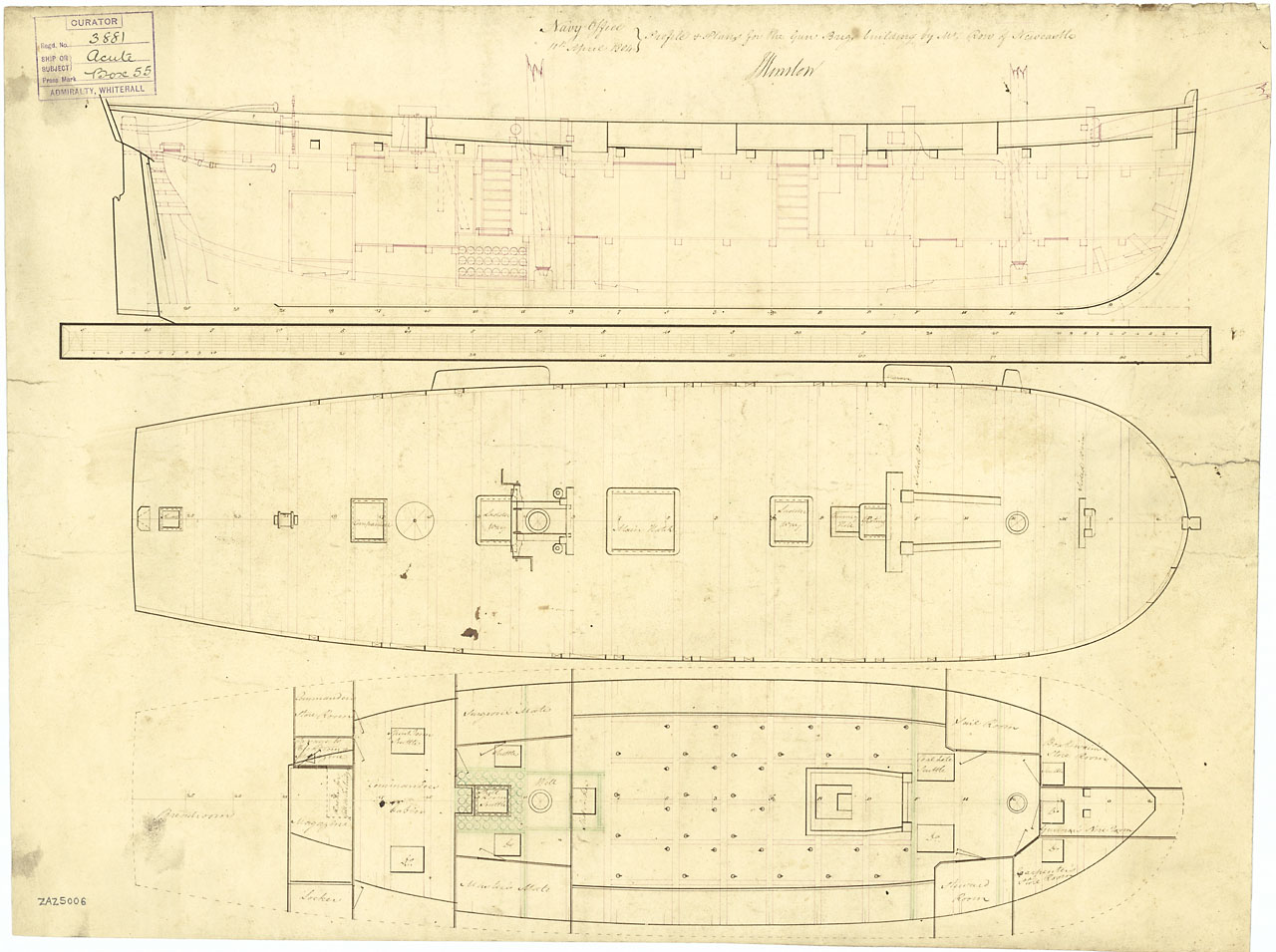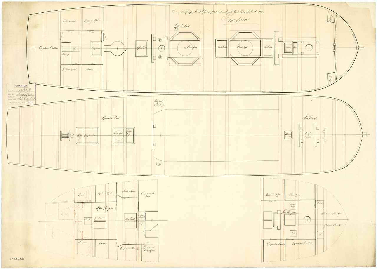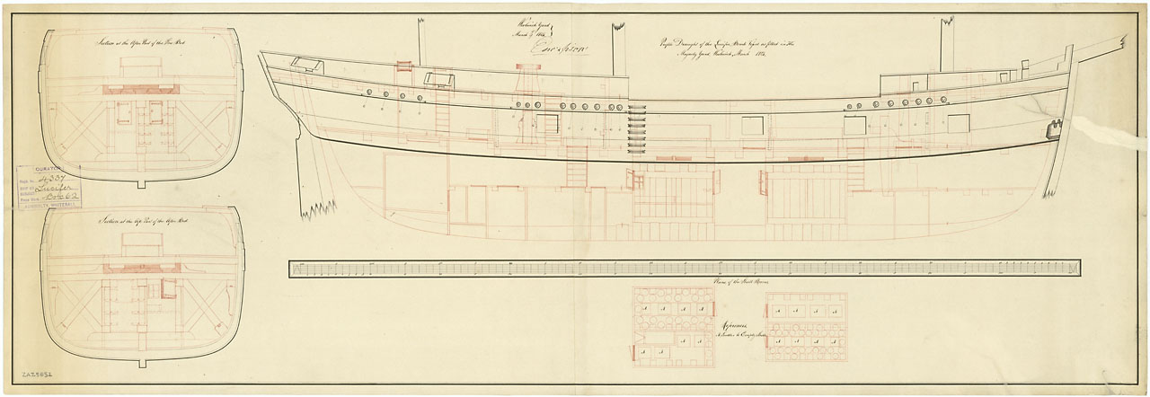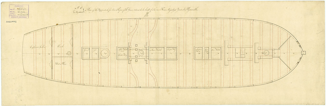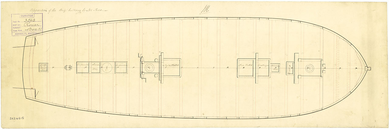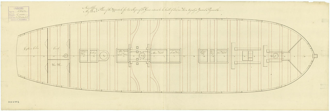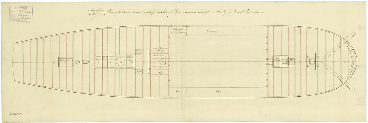 Dauntless (1804); Valorous (1804); Combatant (1804). Scale: 1:48. Plan showing the upper deck for Dauntless (1804), Valorous (1804) and Combatant (1804), all 18-gun Ship Sloops building at Hull and Thorne by Mr Blunt.