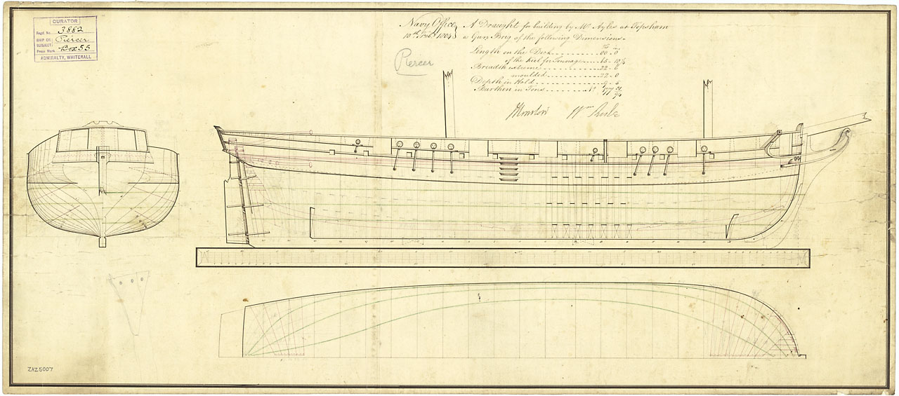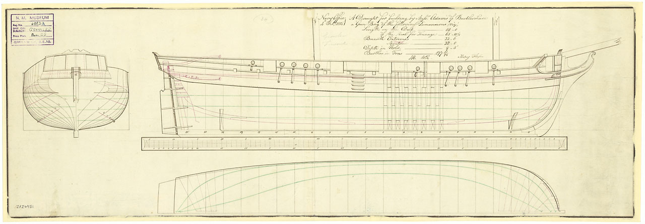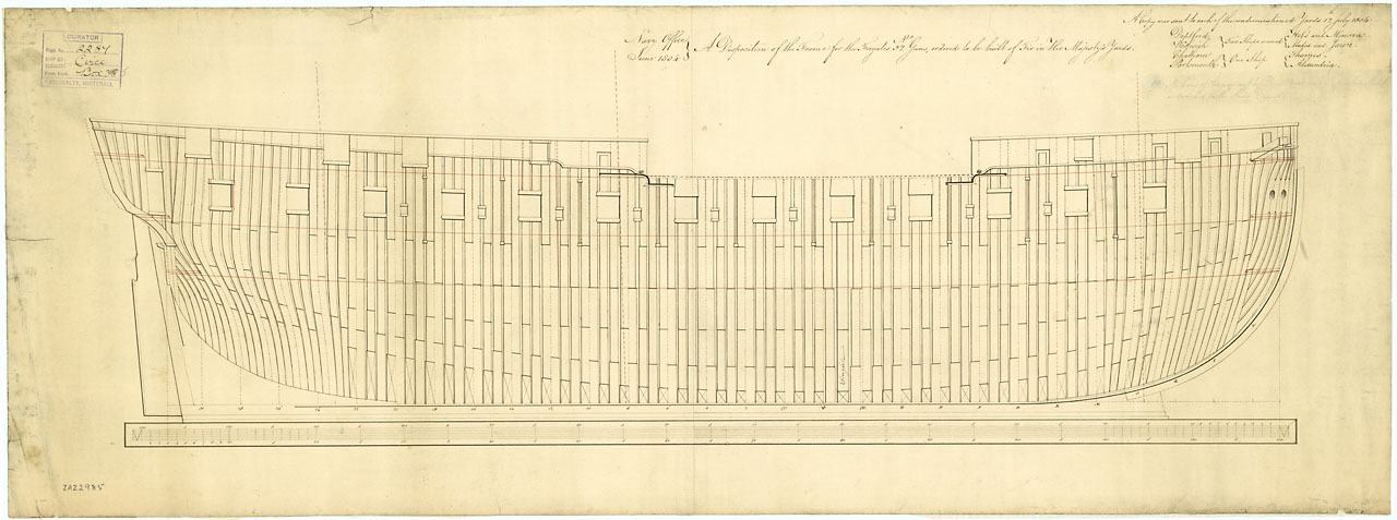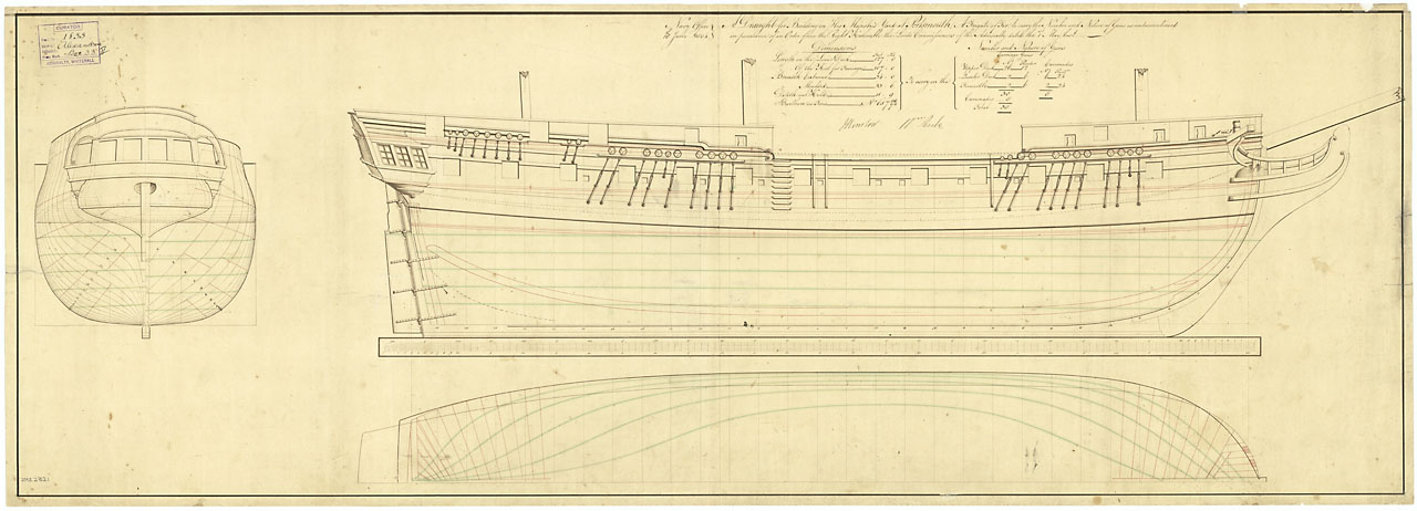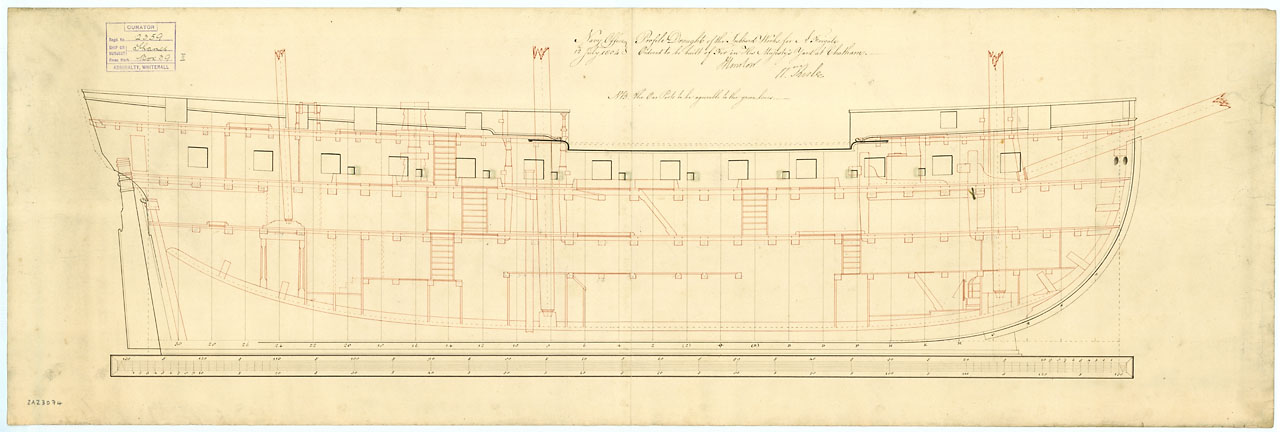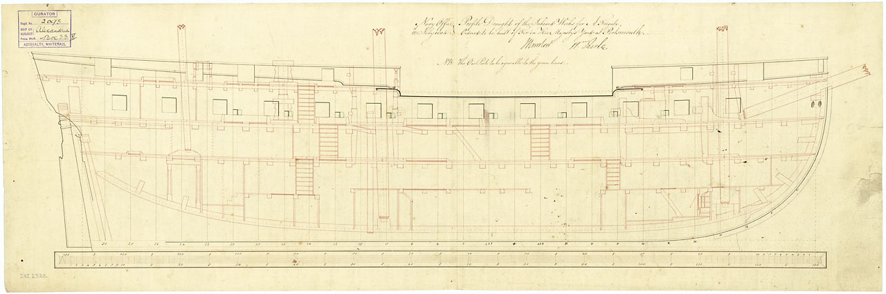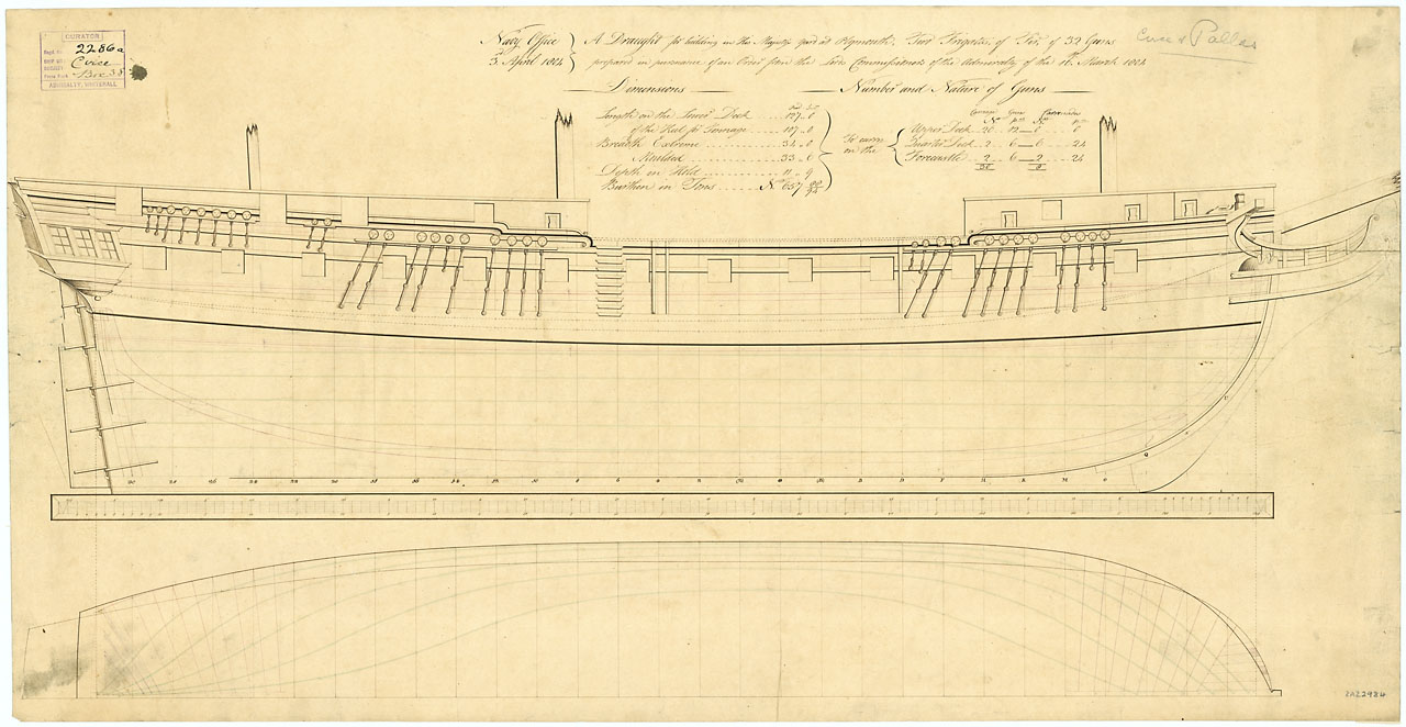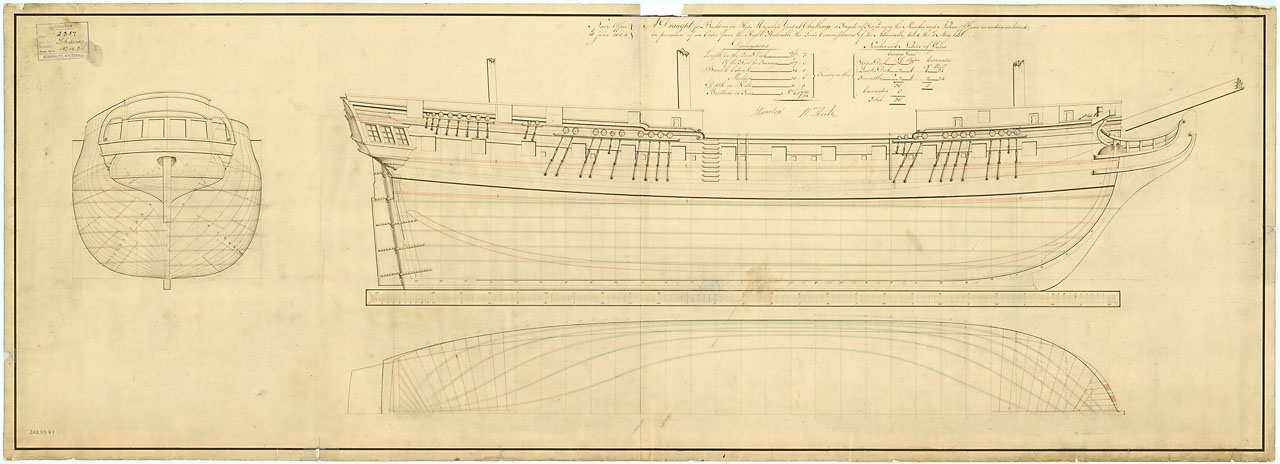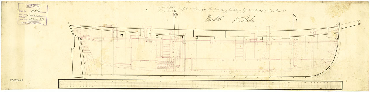 Lady Hamond (fl.1804); Adonis (1806); Alban (1806); Alphea (1806); Bacchus (1806); Barbara (1806); Cassandra (1806); Claudia (1806), Laura (1806); Olympia (1806); Sylvia (1806); Vesta (1806); Zenobia (1806). Scale: 1:48. Plan showing the body plan with h