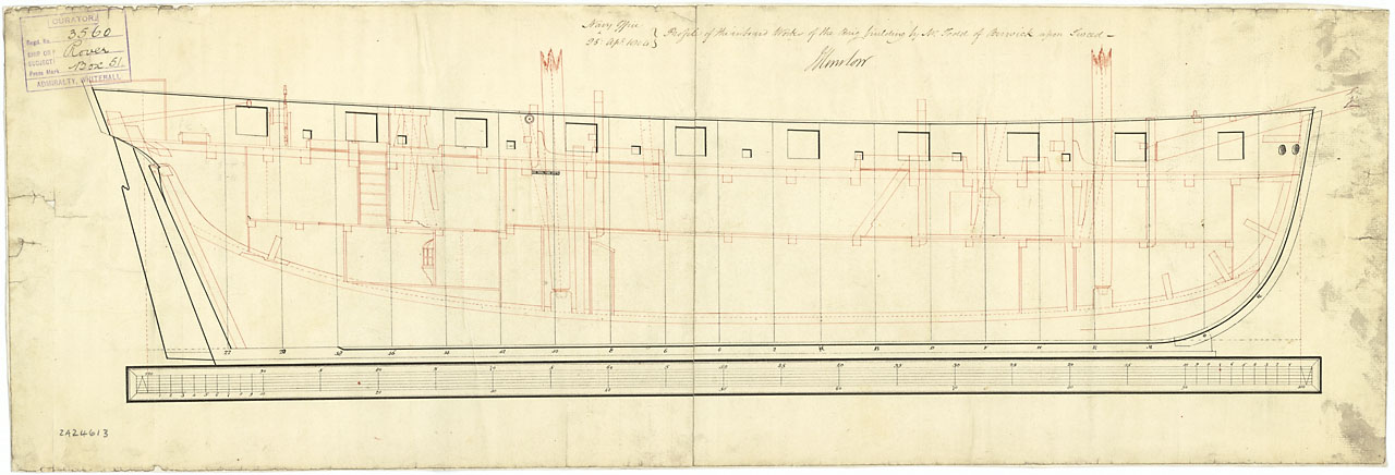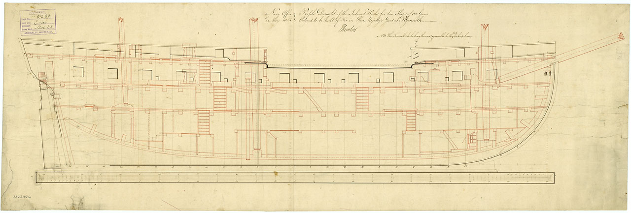 Dauntless (1804); Valorous (1804); Combatant (1804). Scale: 1:48. Plan showing the inboard profile for Dauntless (1804), Valorous (1804) and Combatant (1804), all 20-gun Ship Sloops building at Hull and Thorne by Mr Blunt. The plan includes alterations