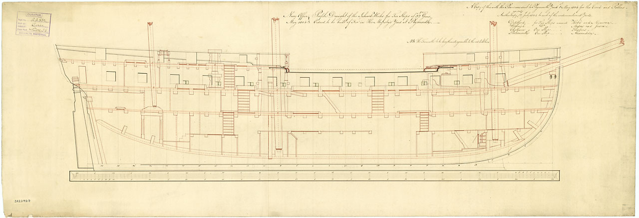 Dauntless (1804); Valorous (1804). Scale: 1:48. Plan showing the inboard profile for Dauntless (1804) and Valorous (1804), both 18-gun Ship Sloops building at Hull by Mr Blunt. The plan includes alterations proposed by Mr Stainforth, MP.