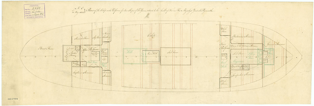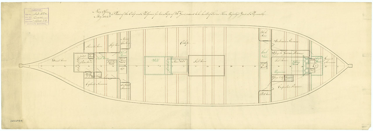 Dauntless (1804); Valorous (1804); Combatant (1804). Scale: 1:48. Plan showing the lower deck with platforms for Dauntless (1804), Valorous (1804) and Combatant (1804), all 18-gun Ship Sloops building at Hull and Thorne by Mr Blunt. The plan includes th