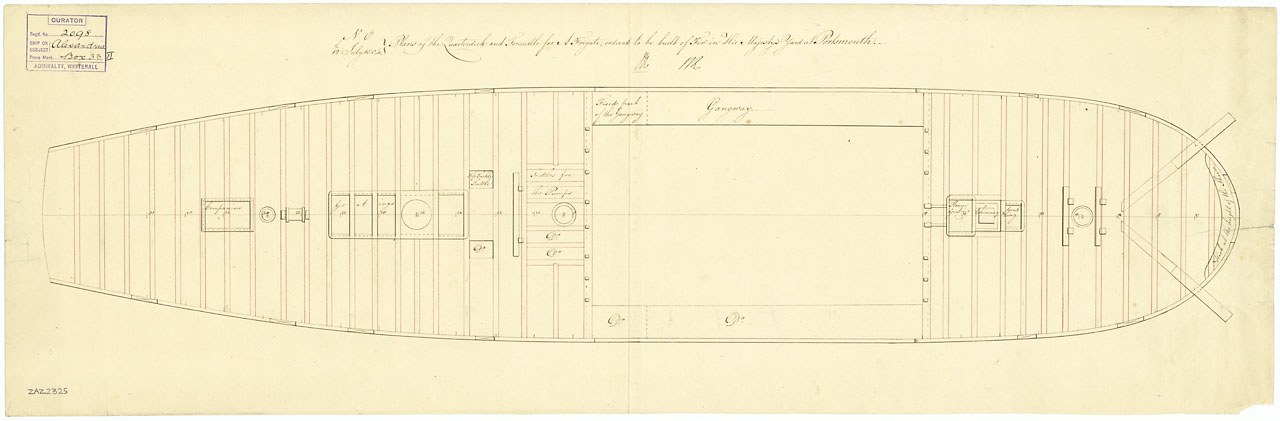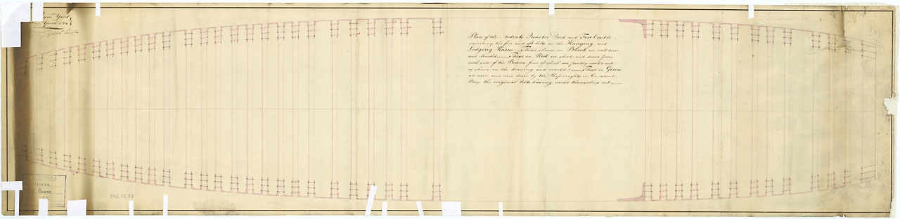 'Ardent' (1796). Scale: 1:48. Plan showing the quarterdeck and forecastle for 'Ardent' (1796), a 64-gun Third Rate, two-decker, describing the fore and aft bolt in the hanging and lodging knees. Those in black ink are well drove and cl