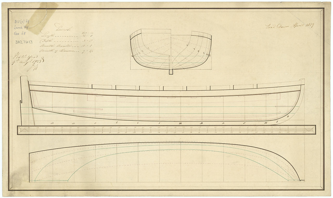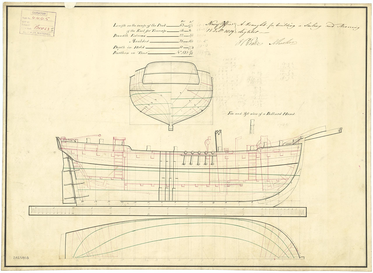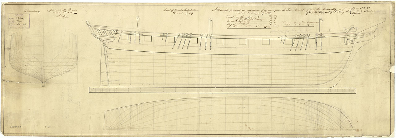 Volage (1825). Scale 1:48. Plan showing the body plan, sheer lines, and longitudinal half breadth as proposed and approved for Volage (1825), a 28-gun, Sixth Rate Sloop.