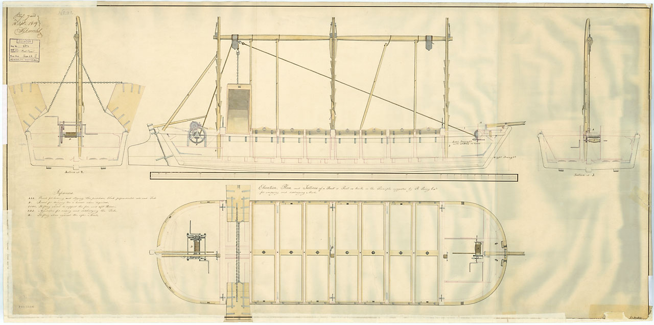66ft Open Barge (fl. 1819). Scale: 1:48. A plan showing three sections, profile, deck plan, and hold plan for a sixty-six foot open swim-headed barge for Deptford Dockyard.