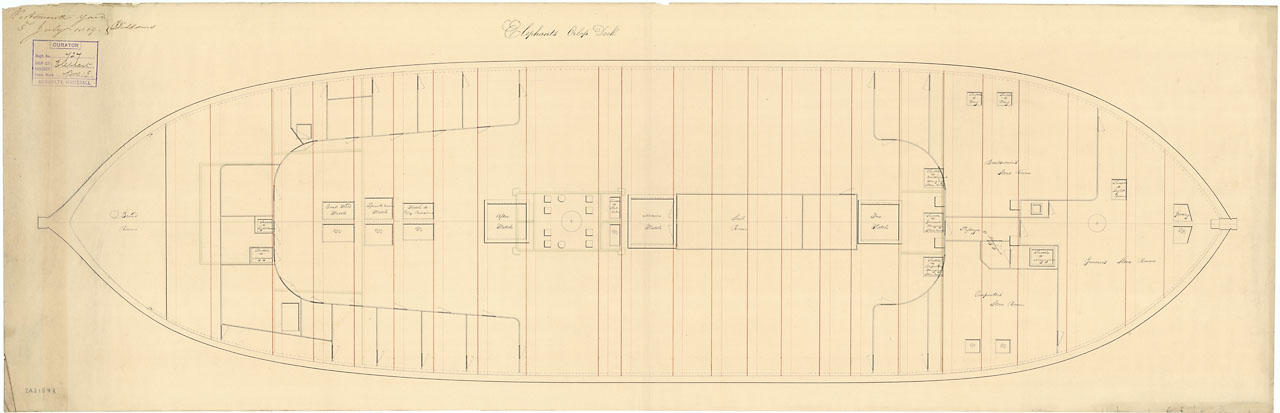 Elephant (1786). Scale: Plan showing the orlop deck for Elephant (1786), a 74-gun Third Rate, two-decker, as fitted after being cut down (razeed) to a 58-gun Fourth Rate Frigate at Portsmouth Dockyard.
