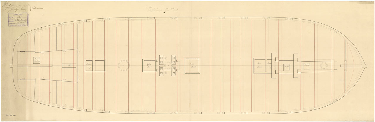Alarm (cancelled 1826), Nimrod (1828) (ex Andromeda). Scale 1:48. Plan showing the upper deck plan with alterations for building Alarm (cancelled 1826), Nimrod (1828) (ex Andromeda), both originally 28-gun, Sixth Rate Frigates, but Nimrod was razeed (cut