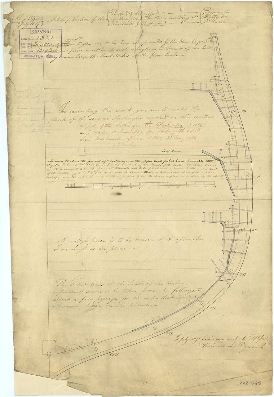 Southampton (1820); Worcester (1843); Portland (1822); Lancaster (1823); Winchester (1822); Chichester (1843). Scale: 1:24. Plan showing the midship section for Southampton (1820); Worcester (1843); Portland (1822); Lancaster (1823); Winchester (1822); C