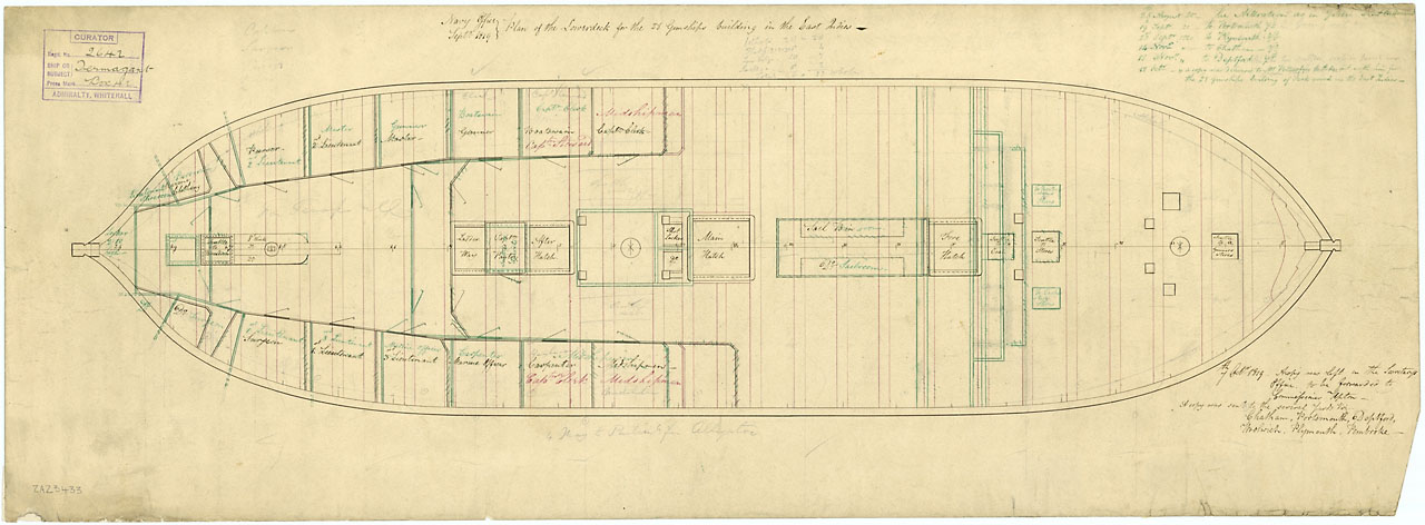Termagant (1822), Alligator (1821), Samarang (1822), Ranger (1820), Niemen (1820), North Star (1824), Tweed (1823), Talbot (1824), Rainbow (1823), Success (1825), Crocodile (1825), Nimrod (1828). Scale 1:48. Plan showing the lower deck plan for Termagant