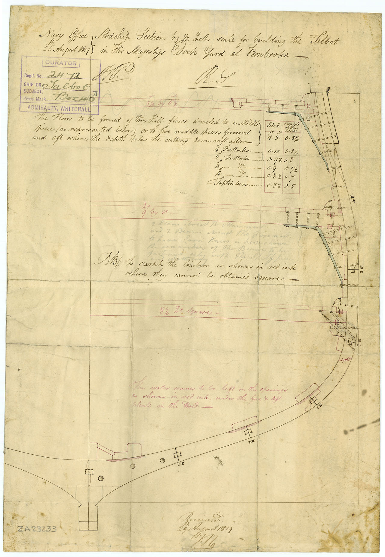 Talbot (1824). Scale 1:24. Plan showing the midship section, illustrating the method of connecting the deck beams to the sides for Talbot (1824), 28-gun, Sixth Rate Frigate (later Sloop) at Plymouth Dockyard. Plan recieved at Plymouth Dockyard on 29th Aug