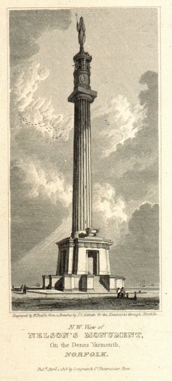 N.W. View of Nelson's Monument, On the Denes Yarmouth, Norfolk. Engraved by W Deeble from a Drawing by J.S. Cotman for the Excursions through Norfolk. Technique includes etching.