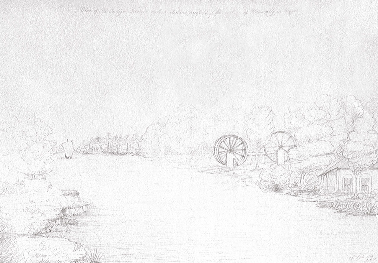 View of the Indigo Factory with a distant prospect of the village of Hanscolly in Bengal. Bound with PAF2693-PAF2699, PAF2701-PAF2720.