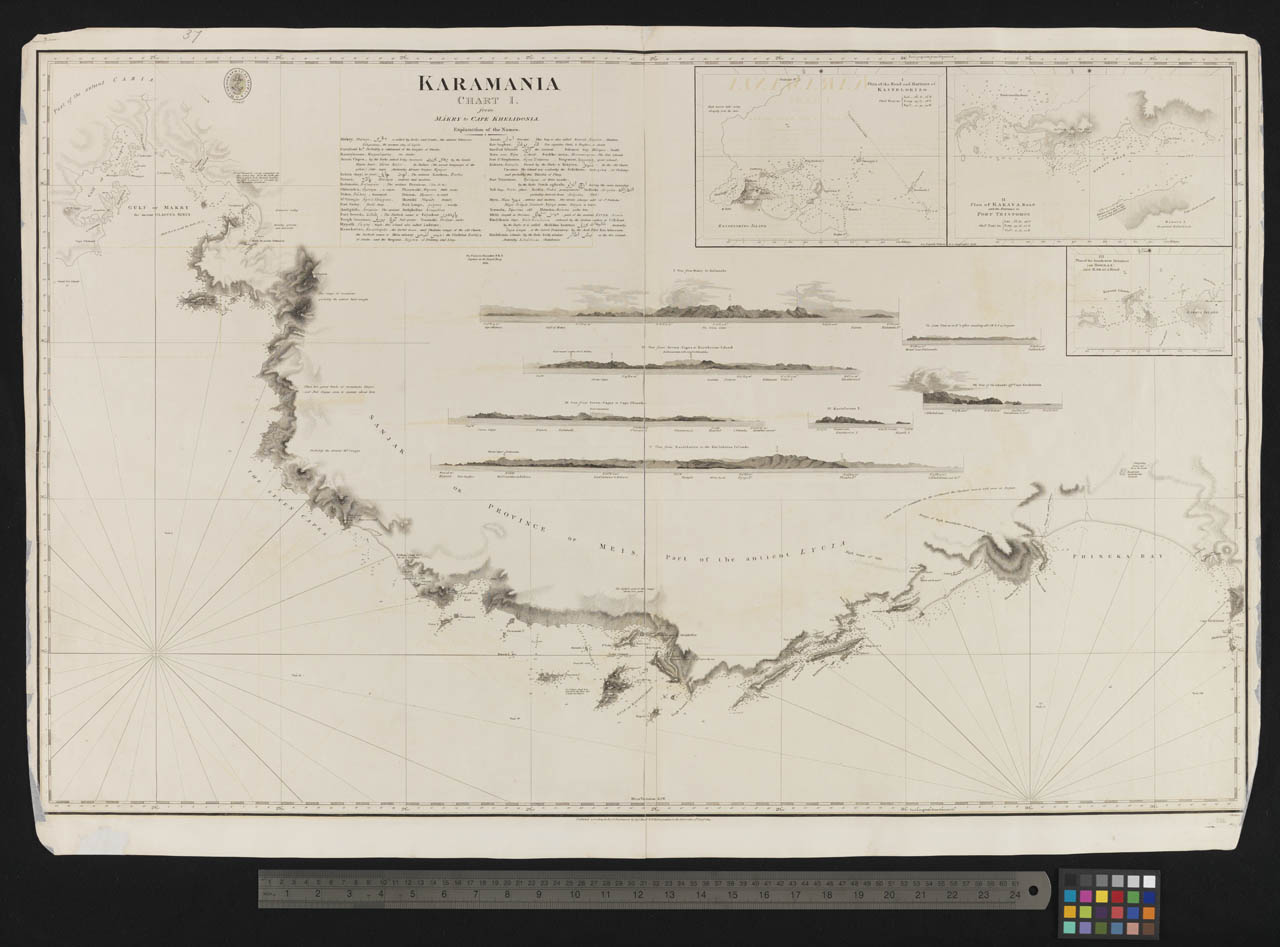 Karamania Chart I from Makry to Khelidonia... by Francis Beaufort F.R.S.... 1811. Scale: circa 1:150,000. Coastal chart of south-west Turkey from Gulf of Makry to Cape Khelidonia with three inset plans. Explanation of place names in Greek, Turkish and Ara