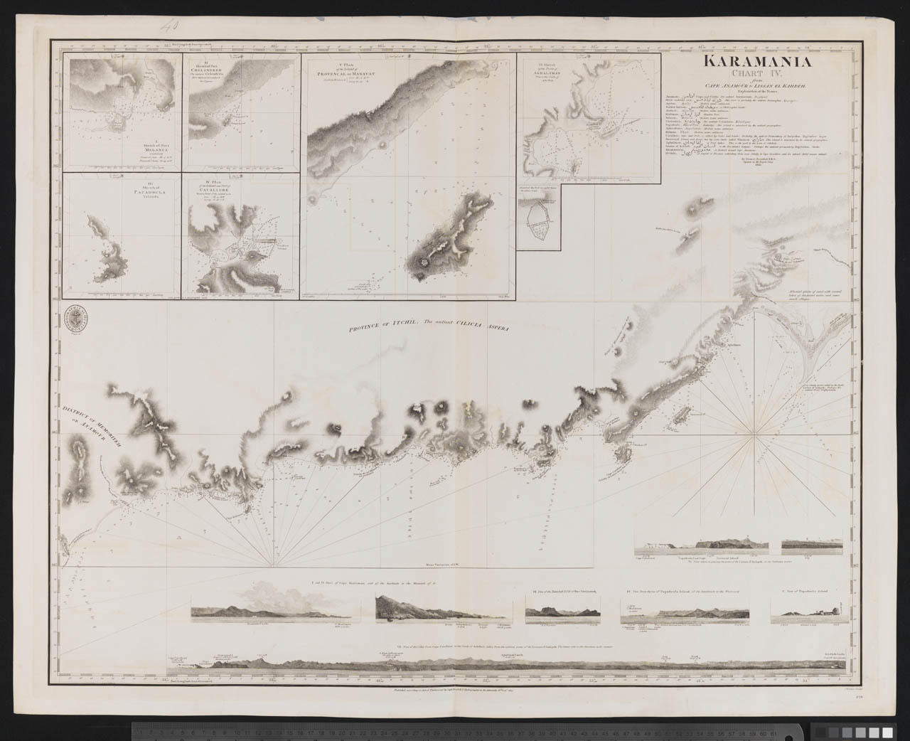 Karamania Chart III from Cape Karaboornoo to Cape Anamour.. Single sheet. Engr. Scale: [ca.1:150 000]. Additional Places: Turkey. Contents Note: Explanation of placenames in Greek, Turkish and Arabic. Five views. Five inset plans, Sketch of an ancient har