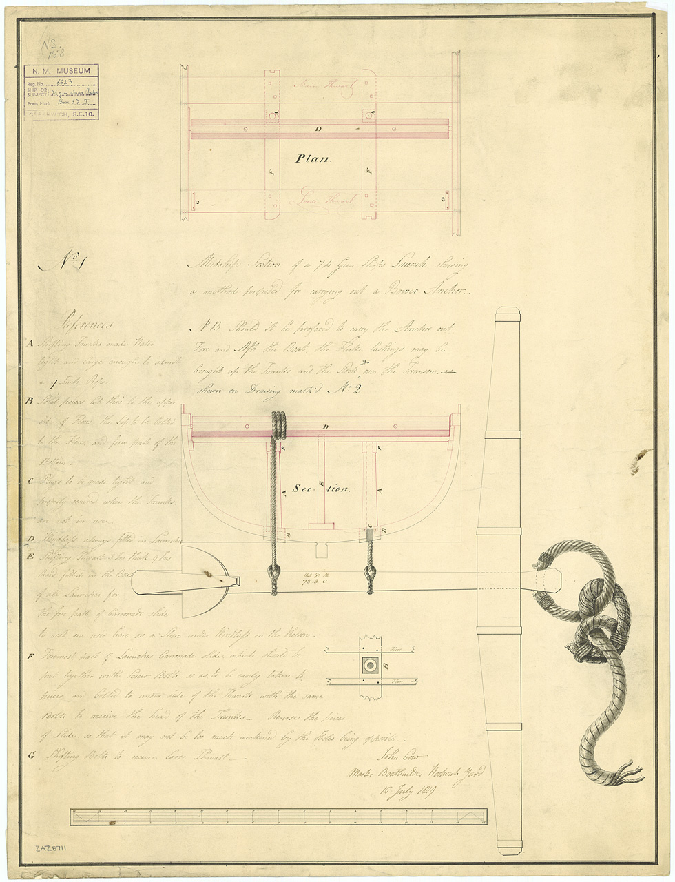 Bulwark (1807). Scale: 1:48. Plan showing the fore-part of the upper deck, and the fore-part of the forecastle as fitted to 'Bulwark' (1807), a 74-gun Third Rate, two-decker. 'Bulwark' was at Chatham Dockyard between 1819 and 1822 for