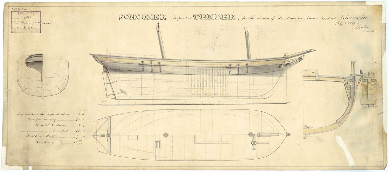 53ft Schooner (circa 1819?). Scale: 1:24. A plan showing body plan with half stern board outline, sheer lines with some inboard detail and midship framing, midship section, and longitudinal half-breadth with full-breadth deck plan, for a fifty-three foot