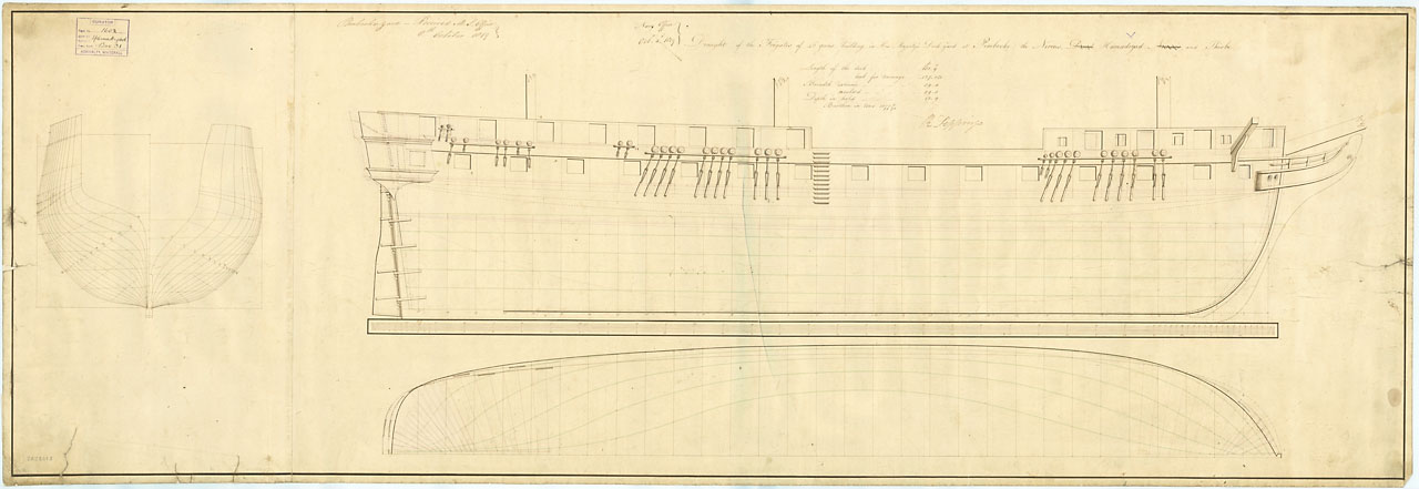 Alarm (cancelled 1826), Nimrod (1828) (ex Andromeda). Scale 1:48. Plan showing the inboard profile plan, with alterations for building Alarm (cancelled 1826), Nimrod (1828) (under original name of Andromeda), both originally 28-gun, Sixth Rate Frigates,