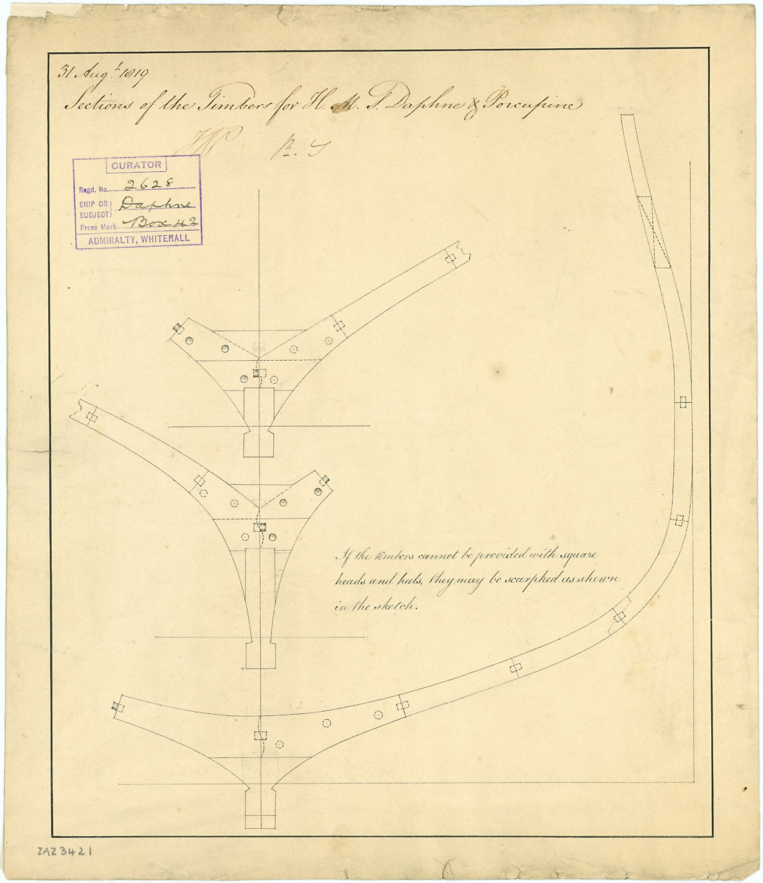 Daphne (cancelled 1832), Porcupine (cancelled 1832). Scale 1:48. Plan showing the section with sections through the keel showing the scarping joints for Daphne (cancelled 1832) and Porcupine (cancelled 1832), both 28-gun, Sixth Rate Sloops. Initialled R[o