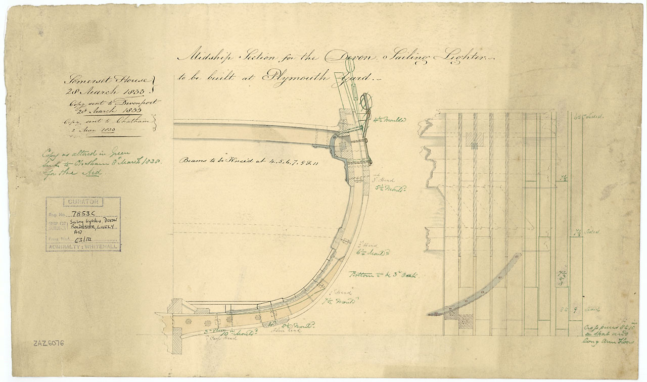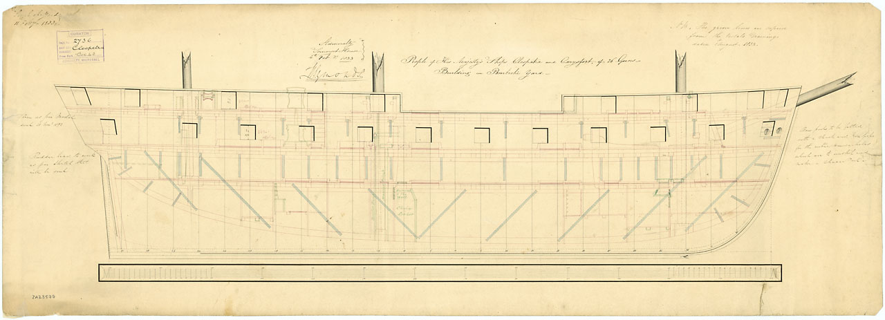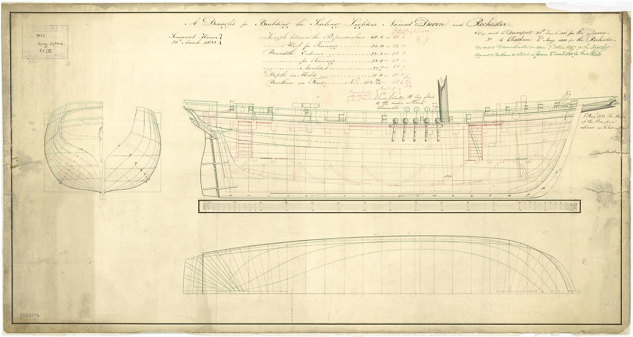 Chichester (1843). Scale: 1:48. A copy of an 1833 plan showing the midship section for Chichester (1843), a 50-gun Fourth Rate Frigate. The copy of Lang's signature suggests that this was copied from a draught originating from Woolwich Dockyard, wh