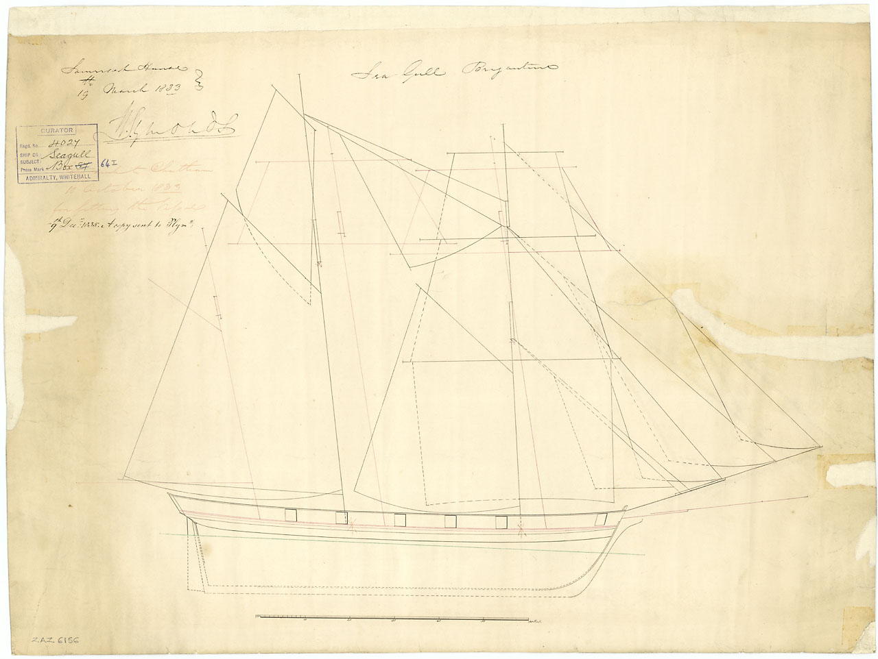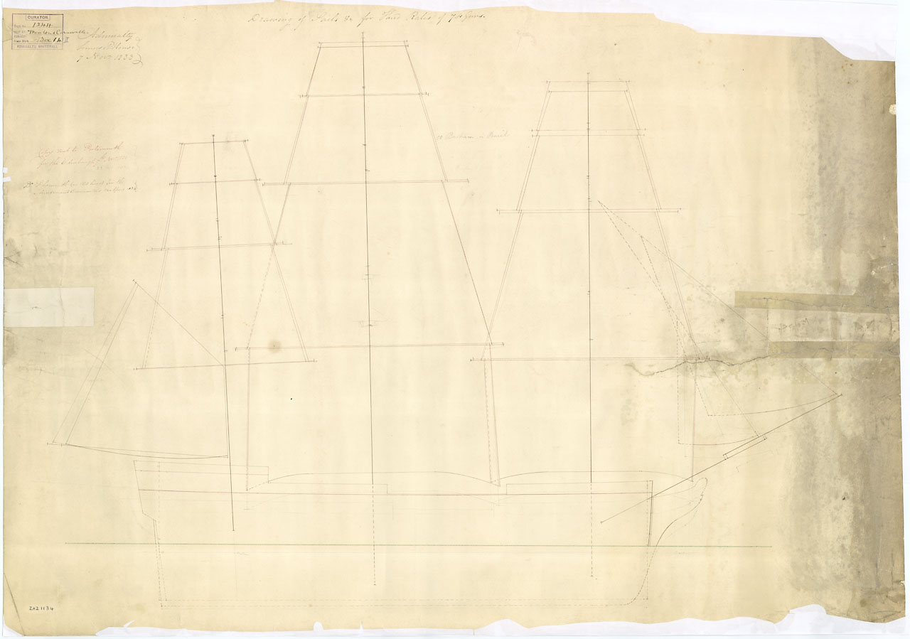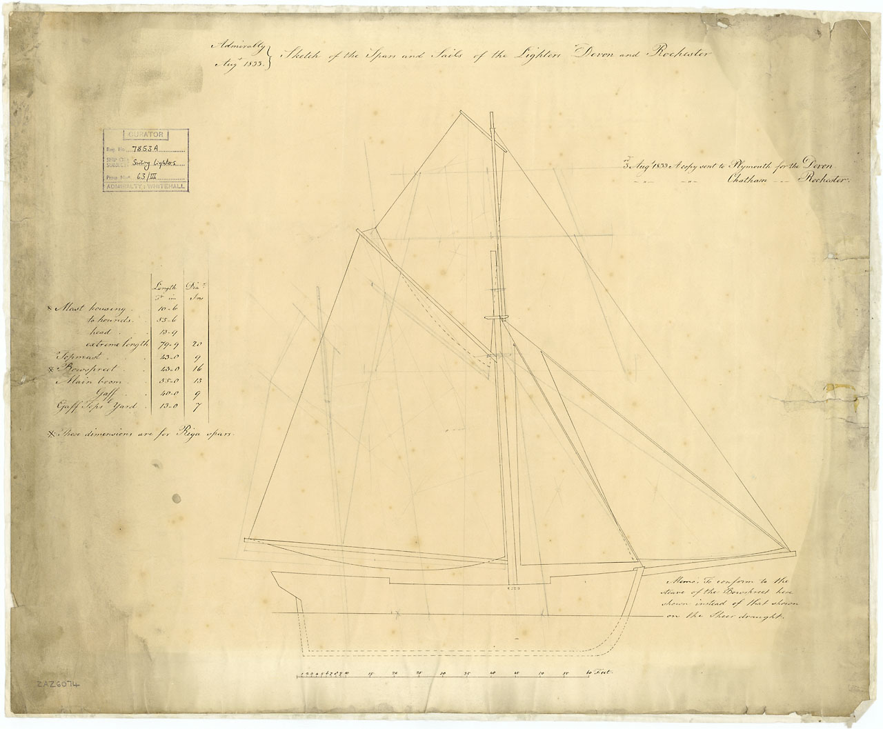 30 ft and 32 ft Boat. Graduated bar scale. Plan showing the sail plan for three-masted lug-rigged 30 ft and 32 ft Boats. Signed W. Symonds [Surveyor of the Navy, 1832-1848]. The plan is annotated with the yard and mast dimensions for 30 ft and 32 ft Bo