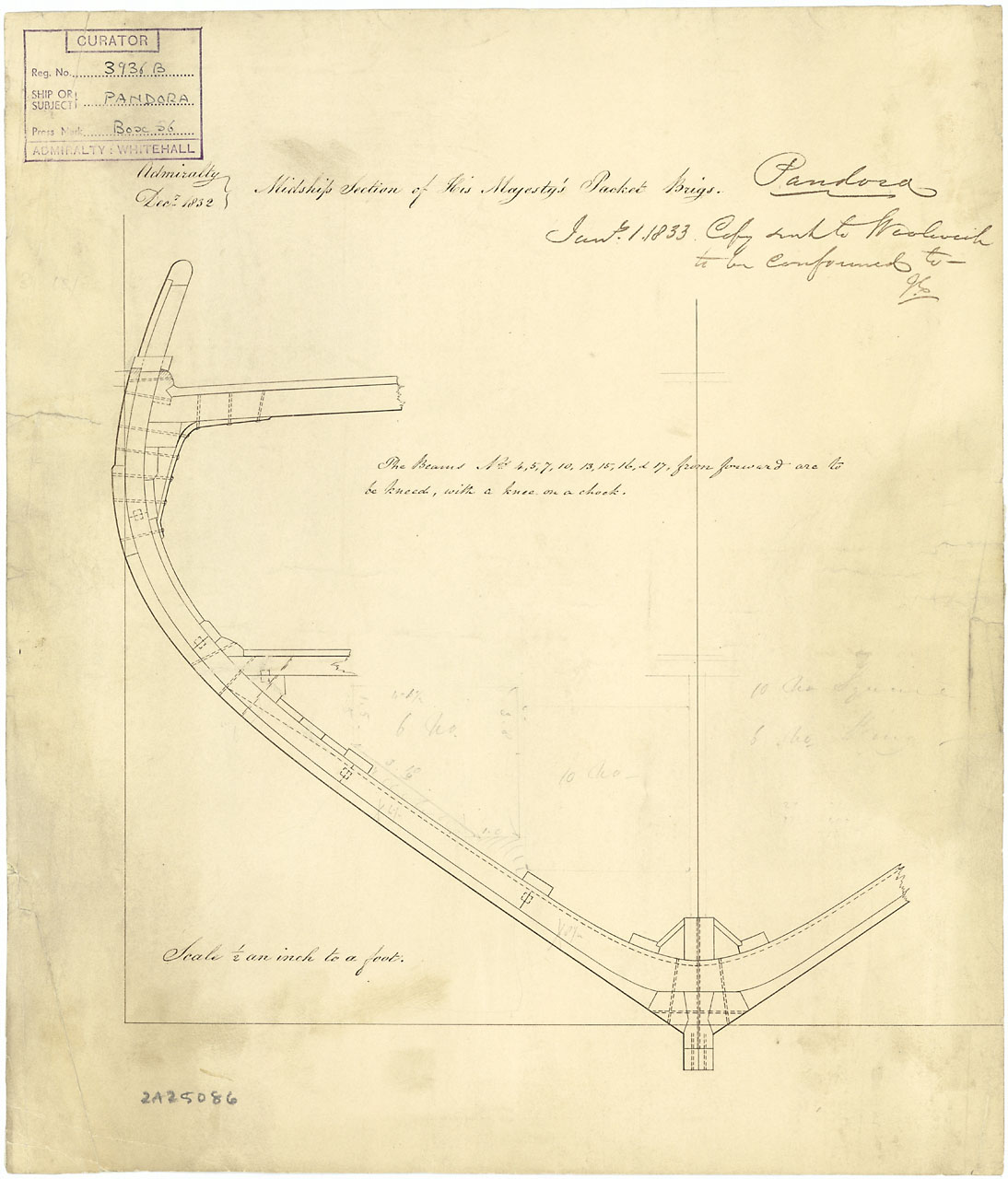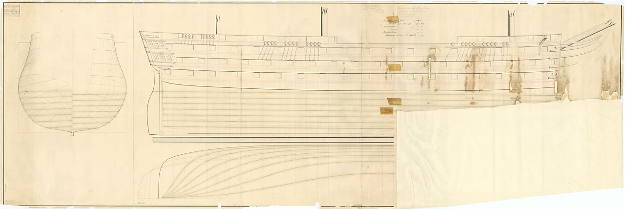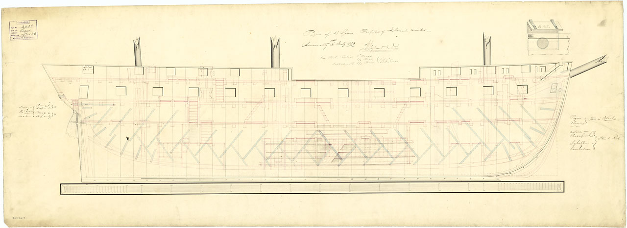 Gloucester (1812). Scale: 1:48. Plan showing the inboard profile with some external detail for Gloucester (1812), a 74-gun Third Rate, two-decker, as cut down and fitted as a 50-gun Fourth Rate Frigate at Chatham Dockyard. Note her circular stern, which