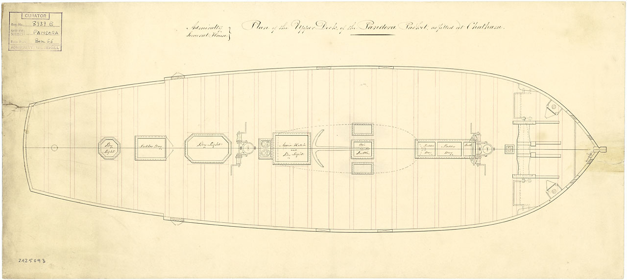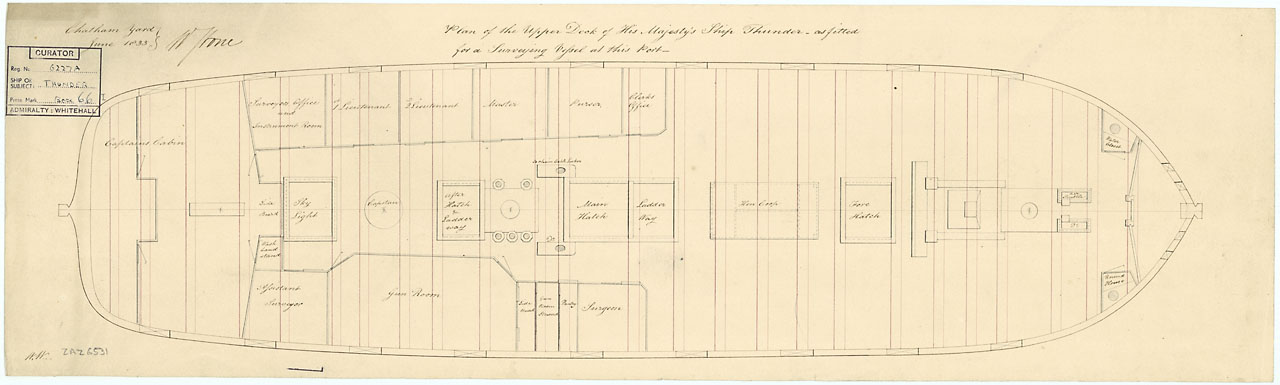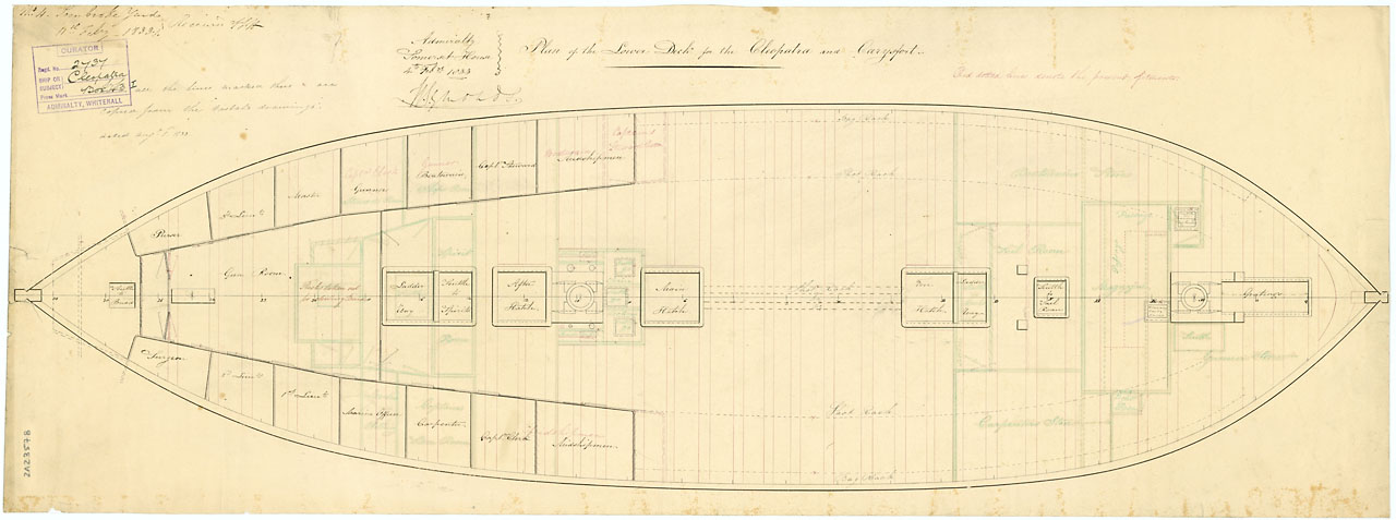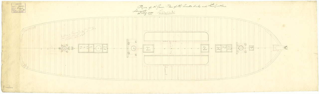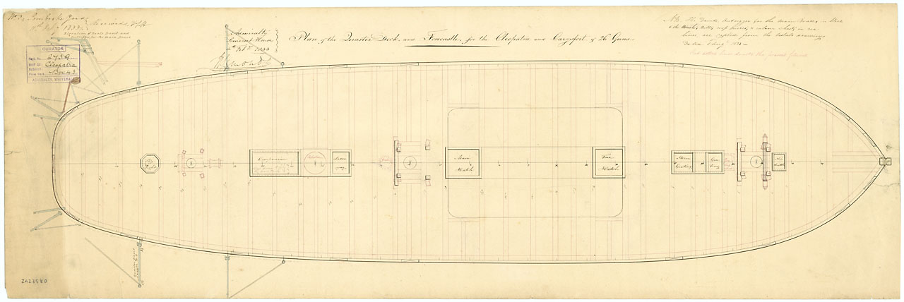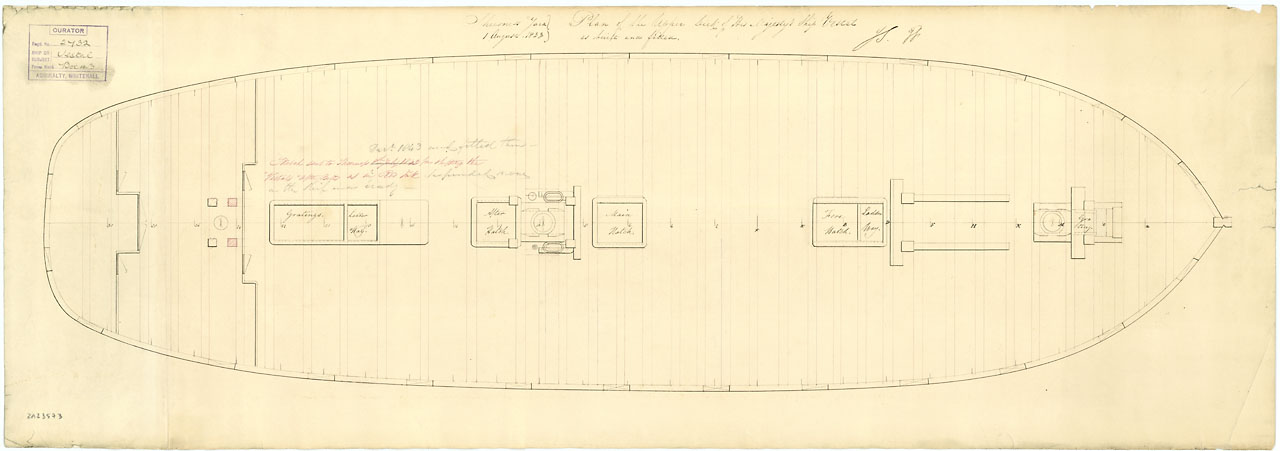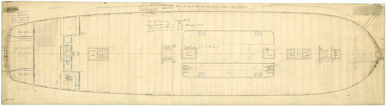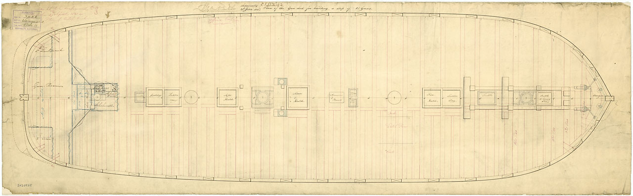 Gloucester (1812). Scale: 1:48. Plan showing the upper deck for Gloucester (1812), a 74-gun Third Rate, two-decker, as cut down and fitted as a 50-gun Fourth Rate Frigate at Chatham Dockyard. Note that this deck was previously the lower deck when she wa