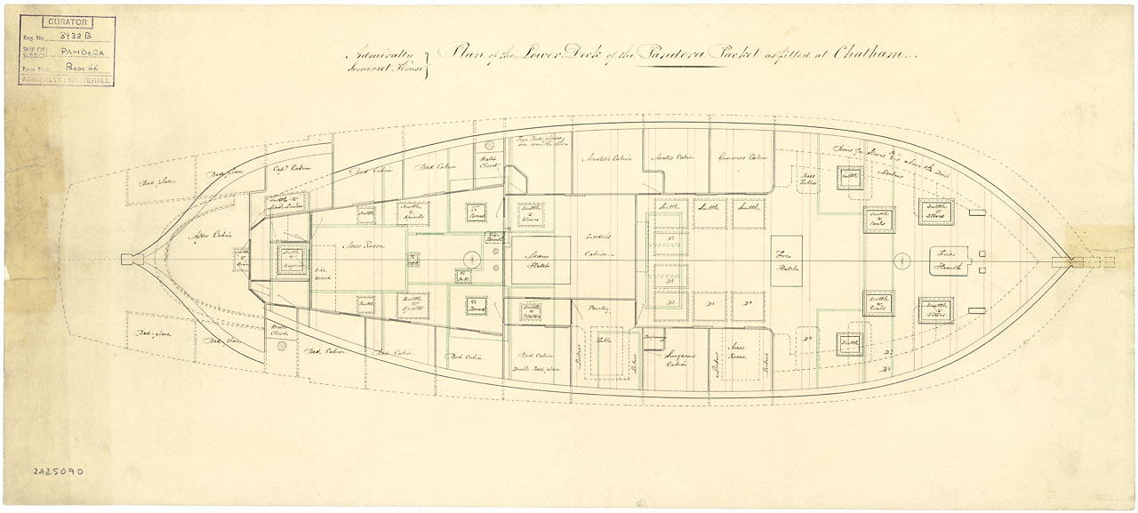 Gloucester (1812). Scale: 1:48. Plan showing the orlop platform with fore & aft platforms for Gloucester (1812), a 74-gun Third Rate, two-decker, as cut down and fitted as a 50-gun Fourth Rate Frigate at Chatham Dockyard.