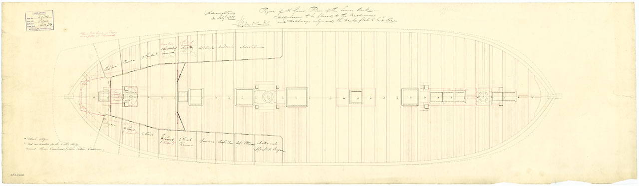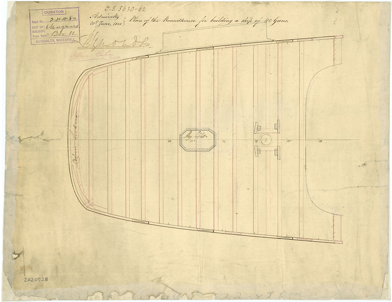 Vanguard (1835); Collingwood (1841). Scale: 1:48. Plan showing the lower deck (gun deck) for building Vanguard (1835), and with later alterations for Collingwood (1841), both an 80-gun Second Rate, two-deckers built at Pembroke Dockyard.